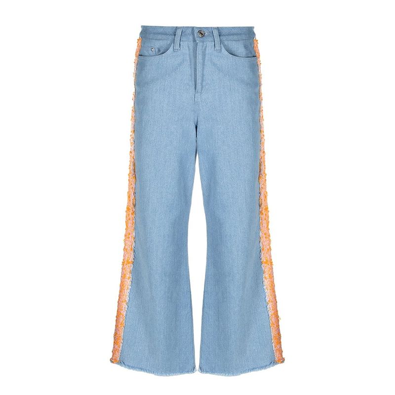 Jean para mujer, confeccionado en denim de 99% algodón y 1% elastano con tejido bouclé que aporta un acabado único. Presenta un corte recto estilo 7/8 que deja al descubierto el tobillo, ideal para un look moderno y sofisticado. Diseñado con tiro alto que realza la figura, cierre de bragueta con botón, trabillas para cinturón y diseño clásico de cinco bolsillos. Su composición en algodón stretch garantiza comodidad y ajuste perfecto. Una prenda distintiva de la marca, perfecta para combinar con blusas o chaquetas y crear outfits versátiles y elegantes.