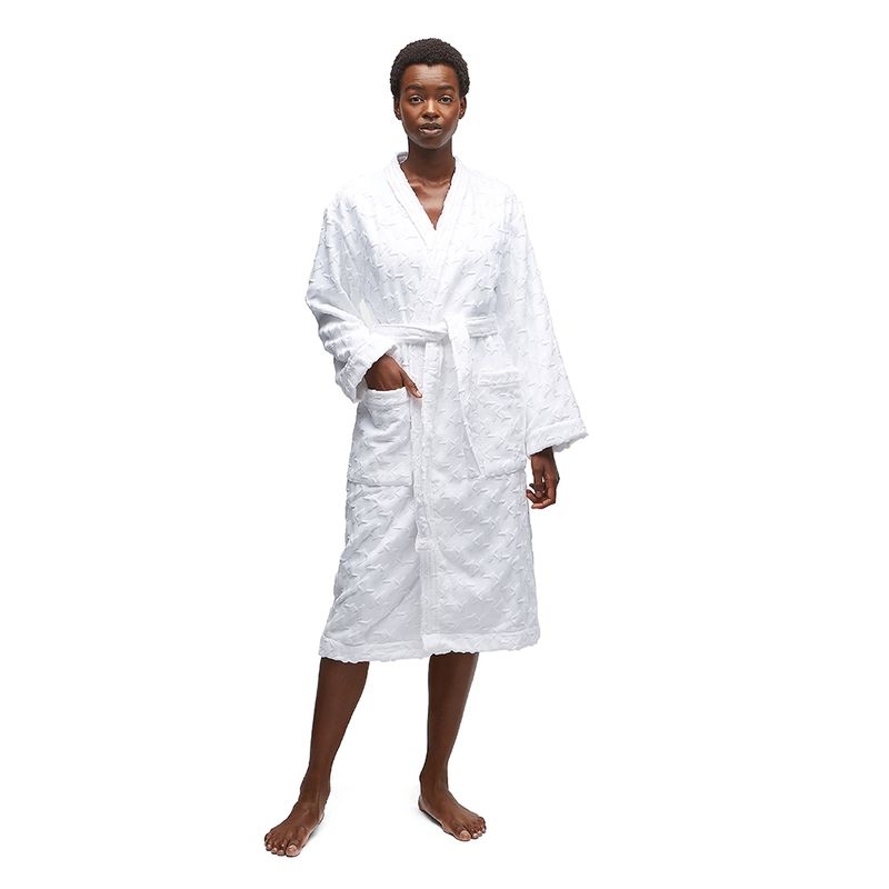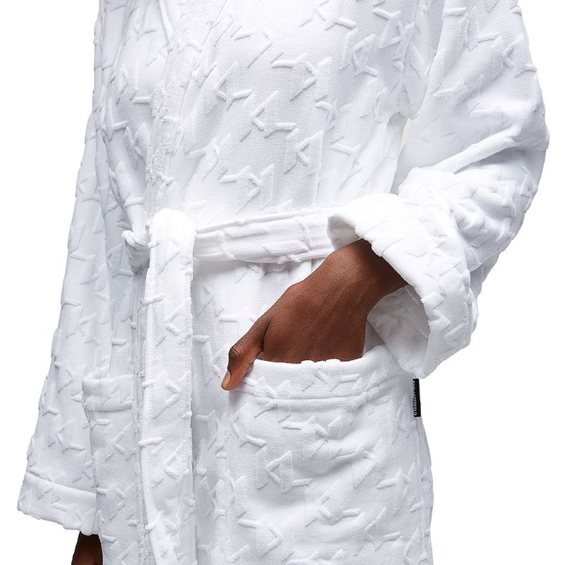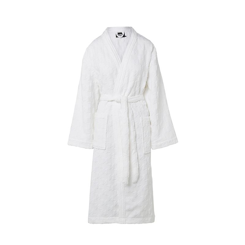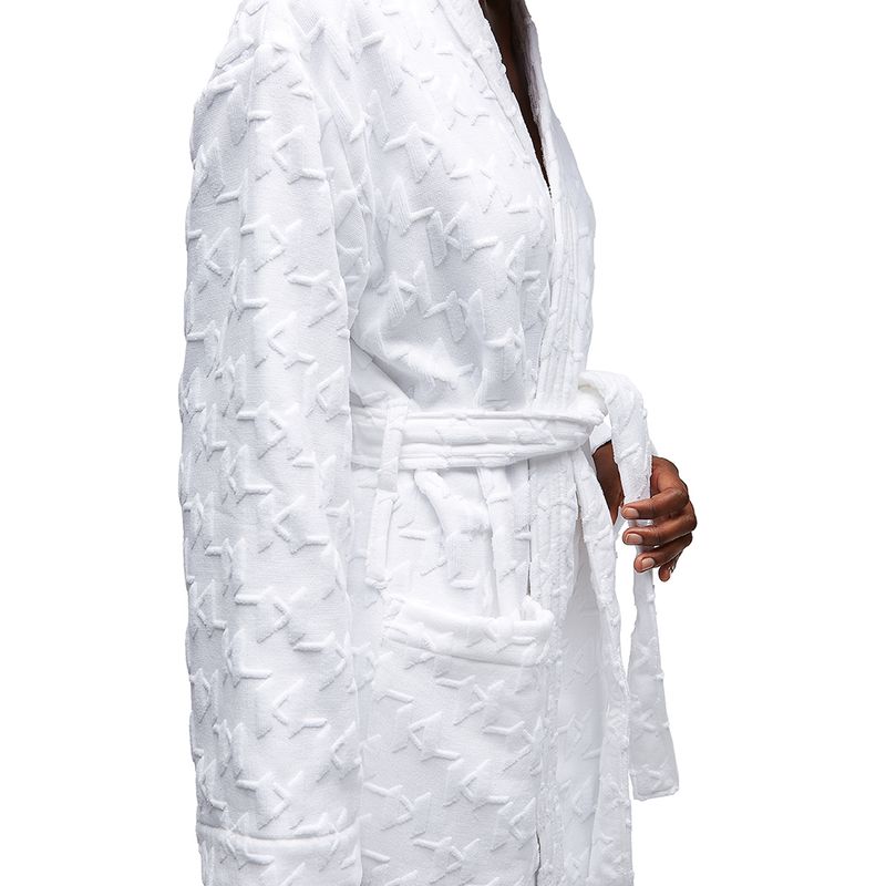 Bata de baño Karl Lagerfeld de lujo confeccionada en algodón 100% esponjoso de alta calidad, ofreciendo suavidad al tacto, comodidad y muy absorbente. Material rico y denso para abrigar, ideal para usar después del baño o para momentos de relax en casa o en un spa. Impresión del monograma de KL sobre jacard le da ese toque de originalidad y elegancia.