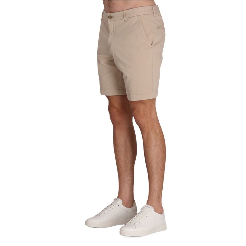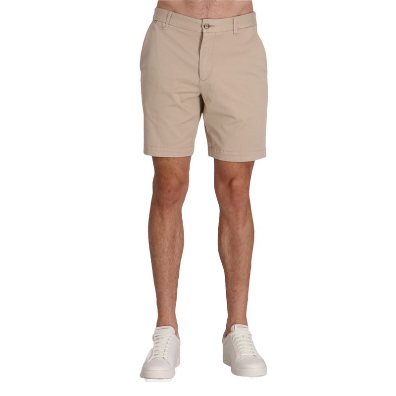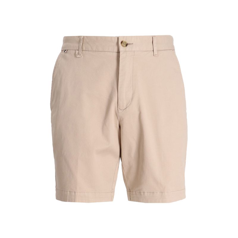 Bermudas en denim elástico con cinco bolsillos y cierre de cremallera.