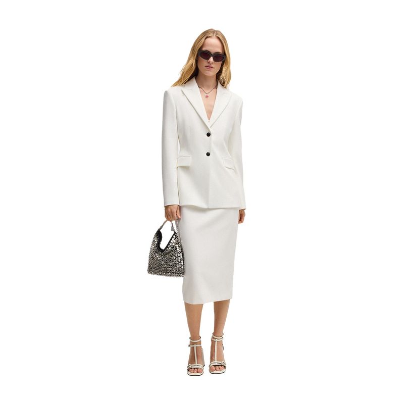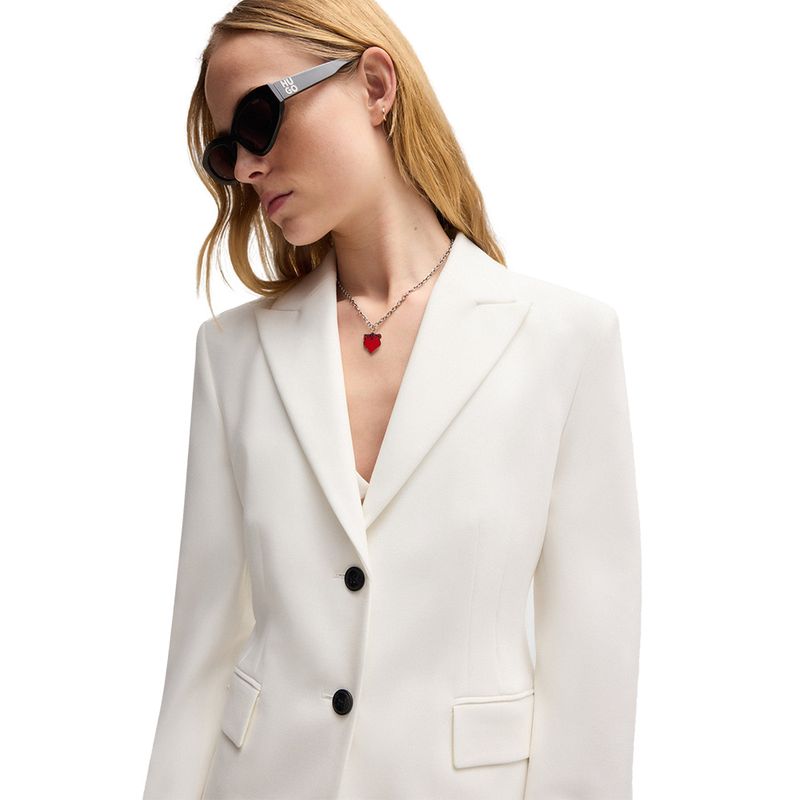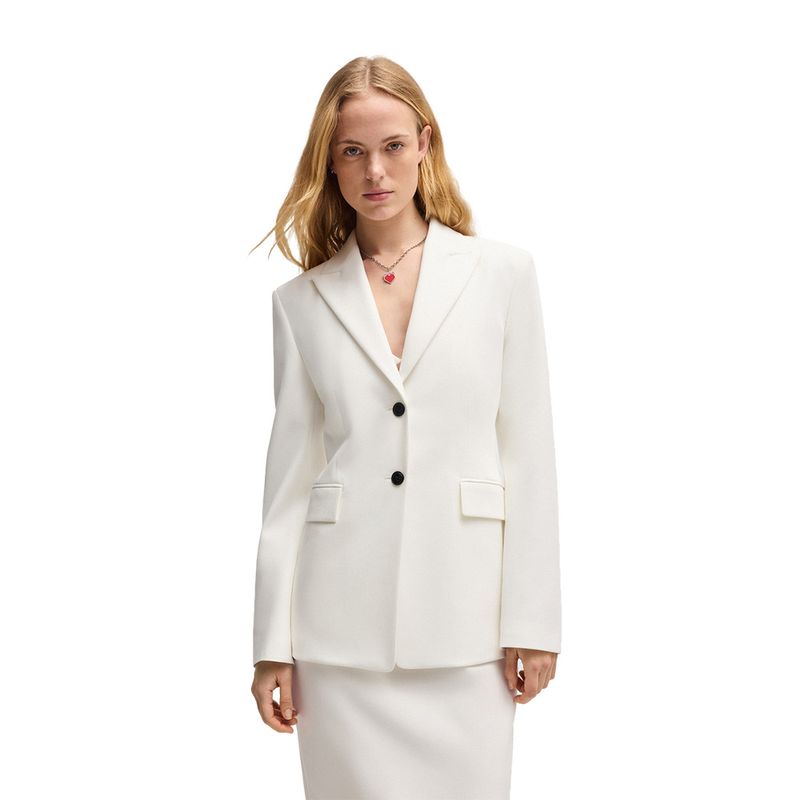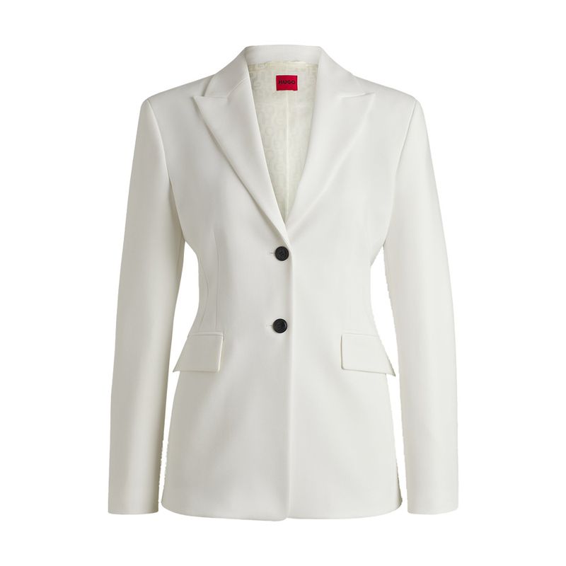 Blazer HUGO para mujer diseñado con un corte entallado que resalta la silueta y ofrece un ajuste elegante. Confeccionado en una mezcla de poliéster, viscosa y elastano que aporta estructura, suavidad y comodidad. Presenta solapas de muesca, cierre frontal con dos botones y bolsillos con solapa. Su tono natural lo convierte en una prenda versátil ideal para looks formales, de oficina o eventos especiales. Este blazer combina la sofisticación contemporánea y la calidad característica de la marca HUGO.