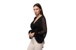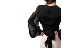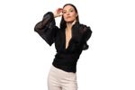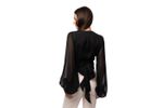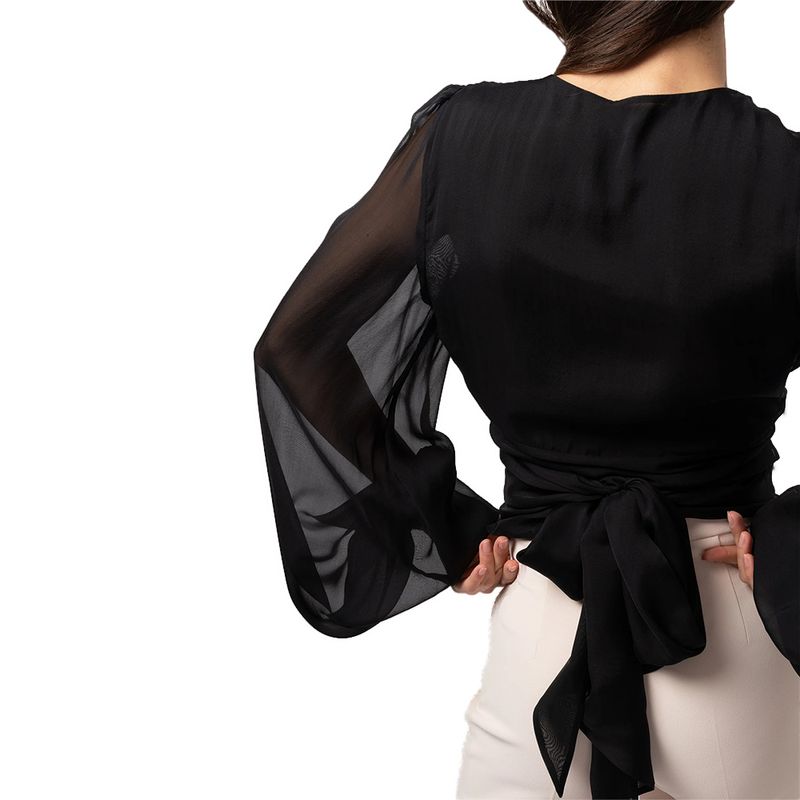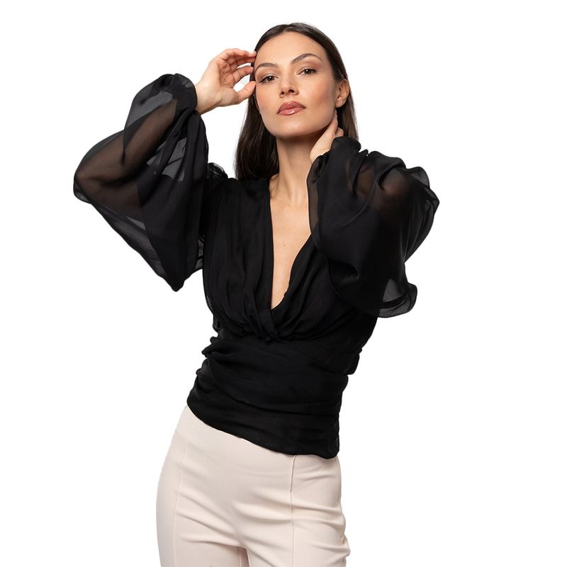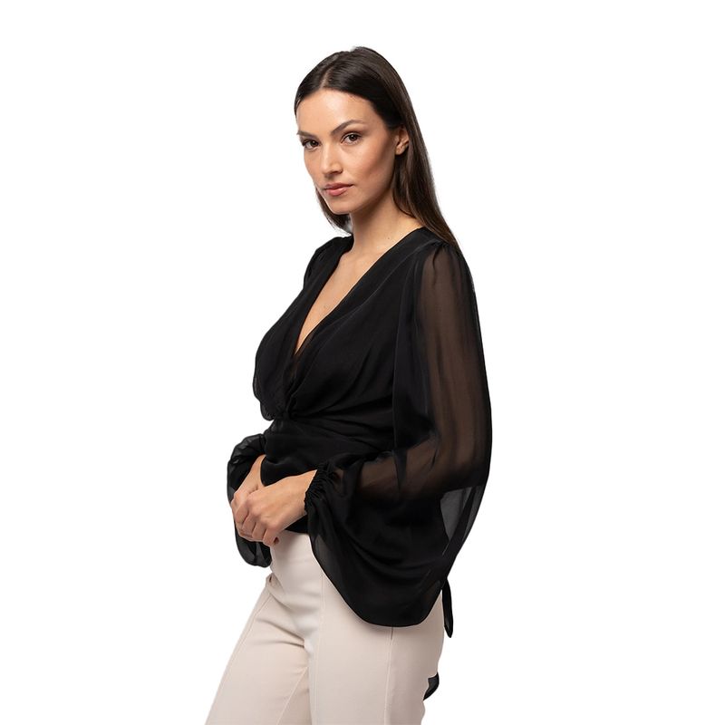 Blusa de seda con transparencias sutiles y drapeado elegante que realza la silueta