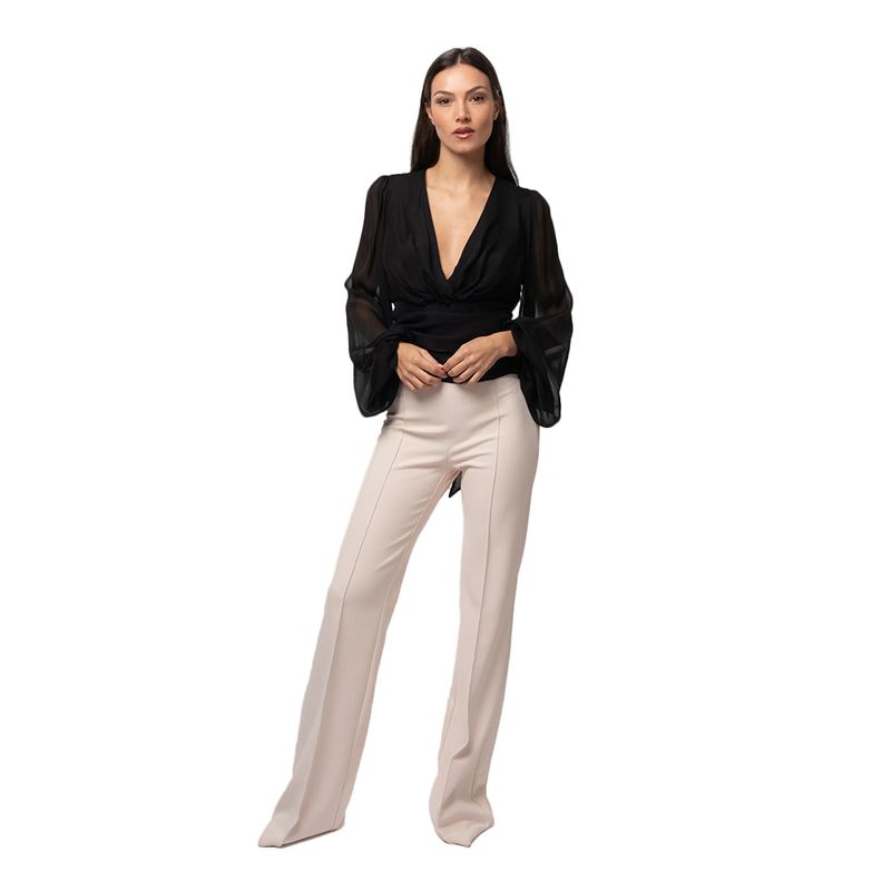 Blusa Elisabetta Franchi para mujer, confeccionada en seda 100% que aporta una textura ligera, suave y delicadamente translúcida. Presenta un sofisticado escote profundo en V con drapeado frontal que estiliza el torso, acompañado de mangas largas amplias con ecto vaporoso que añaden movimiento y feminidad al diseño. Su ajuste ceñido en la cintura realza la figura, creando un equilibrio perfecto entre sensualidad y elegancia. Ideal para looks nocturnos, eventos especiales o estilismos sofisticados, esta blusa rleja el glamour y la exquisitez característicos de la marca italiana