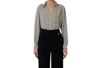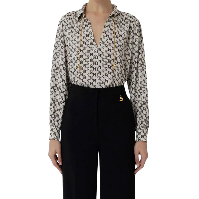 Blusa Elisabetta Franchi para mujer, confeccionada en poliéster 100% que garantiza ligereza, resistencia y una caída impecable. Presenta un rinado estampado geométrico en tonos negro y beige, característico del estilo sofisticado de la firma italiana. Su diseño incluye escote en V con cuello camisero relajado y delicado detalle de cadena dorada frontal, que aporta un acento de lujo y feminidad. Las mangas largas con puño clásico completan una silueta elegante y versátil, ideal para looks de oficina, eventos formales o combinaciones casual chic