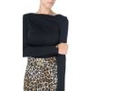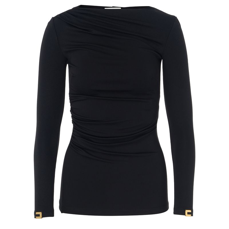 Blusa Elisabetta Franchi para mujer confeccionada en un tejido suave y elástico de viscosa con elastano, diseñada para ofrecer ajuste cómodo y elegante. Presenta un corte entallado con drapeado frontal y lateral que estiliza la figura, cuello asimétrico sutil y mangas largas que aportan sofisticación. El color negro ruerza su versatilidad, mientras que los delicados detalles metálicos en los puños añaden un acento distintivo de la marca. Ideal para looks formales, eventos nocturnos o combinaciones elegantes con pantalones sastre o faldas de talle alto, esta blusa encarna el estilo rinado y femenino de Elisabetta Franchi