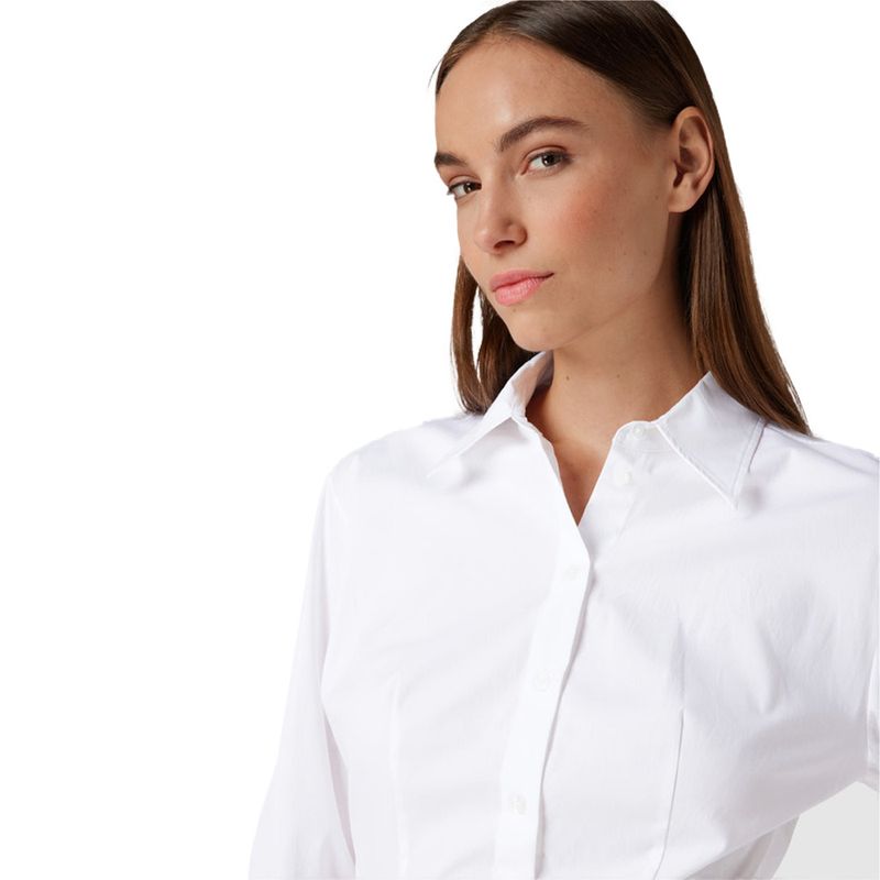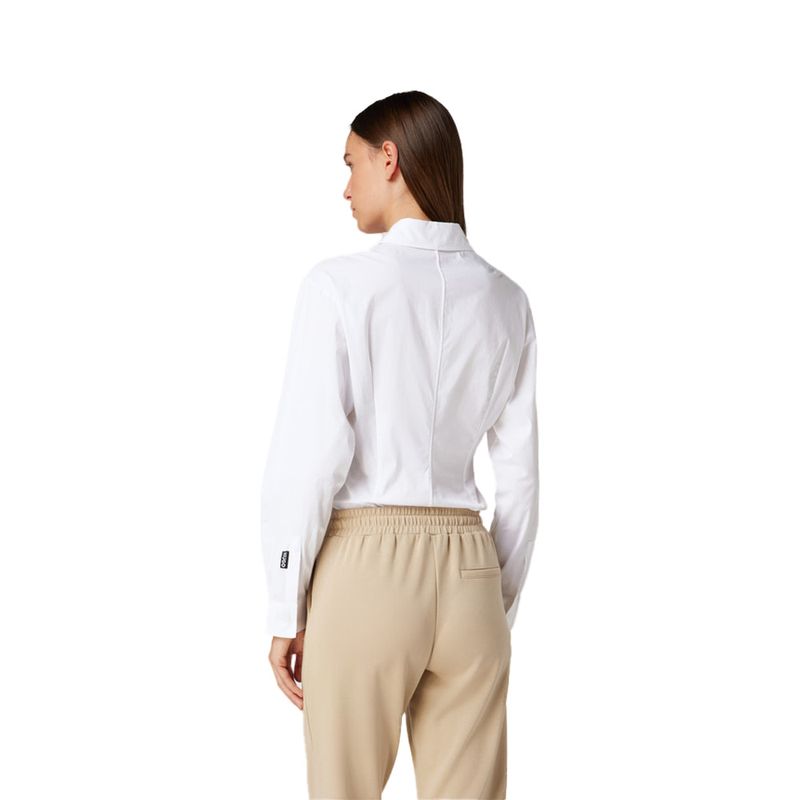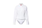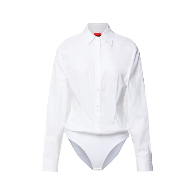 Blusa tipo body HUGO para mujer, confeccionada en mezcla de algodón elástico (97% algodón, 3% elastano) que ofrece suavidad, transpirabilidad y un ajuste flexible Su diseño entallado estiliza la silueta, mientras que el cuello clásico y los botones frontales aportan un aire sofisticado y versátil Perfecta para combinar con pantalones de talle alto o faldas, ideal para ocasiones formales o looks casuales con un toque elegante