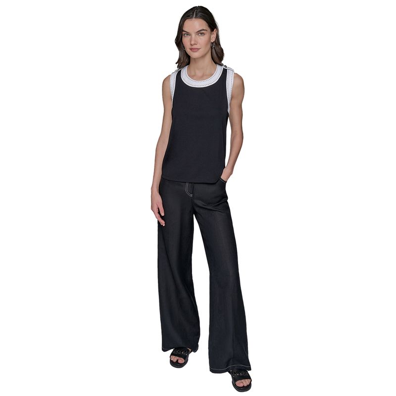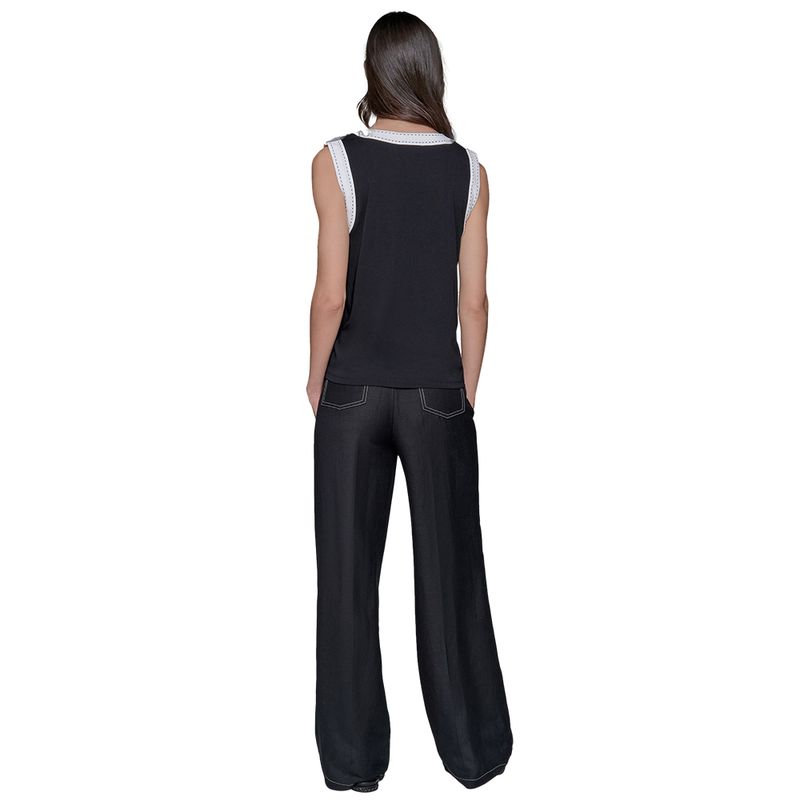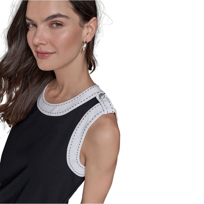 Blusa sin mangas Karl Lagerfeld para mujer, confeccionada en 100% poliéster, ideal para un look moderno y sofisticado. Presenta un diseño bicolor con base negra y cuello blanco contrastante decorado con delicadas costuras en tono azul, que añaden un detalle distintivo y elegante. Su tejido ligero y de caída fluida ofrece comodidad y frescura, perfecta para climas cálidos o para usar como capa base en outfits más elaborados. Una prenda versátil que combina con faldas, pantalones o chaquetas, reflejando el estilo chic y contemporáneo de Karl Lagerfeld.