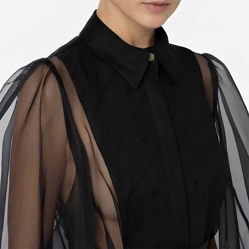 Body camisa Elisabetta Franchi para mujer confeccionado en una mezcla de lyocell y elastano que proporciona suavidad, elasticidad y excelente adaptación al cuerpo. Presenta un rinado diseño camisero en color negro con cuello clásico y cierre frontal oculto, complementado con mangas largas en tul rosado semitransparente de gran volumen que aportan un contraste sofisticado y femenino. La cintura estructurada y el formato tipo body garantizan un ajuste impecable y estilizado. Ideal para combinar con jeans de talle alto o pantalones elegantes, es una prenda de alto impacto visual perfecta para looks nocturnos, eventos especiales o estilismos urbanos de lujo
