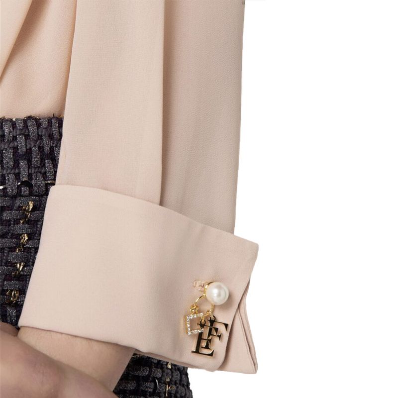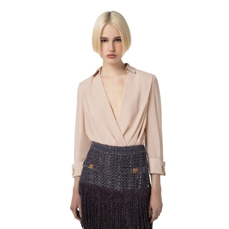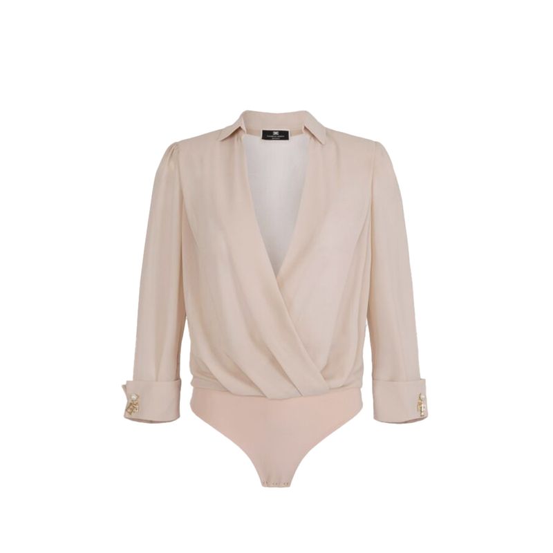 Body camisa Elisabetta Franchi para mujer confeccionado en 100% poliéster, un material ligero y de tacto suave que garantiza comodidad y un acabado impecable. Presenta un sofisticado diseño cruzado con escote en V que aporta feminidad y elegancia, acompañado de mangas largas con puños estructurados y detalles metálicos distintivos de la firma. Su formato tipo body asegura un ajuste perfecto y prolijo, ideal para combinar con faldas midi, pantalones de talle alto o looks de noche rinados. Una prenda versátil y elegante que rleja el estilo femenino y contemporáneo de Elisabetta Franchi