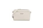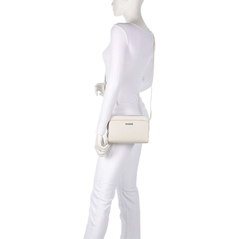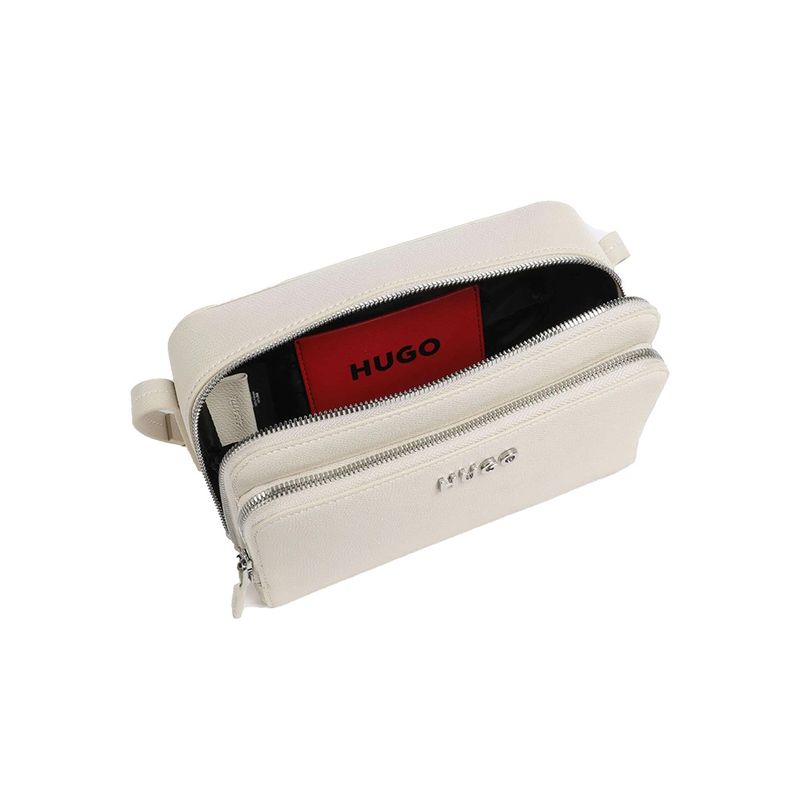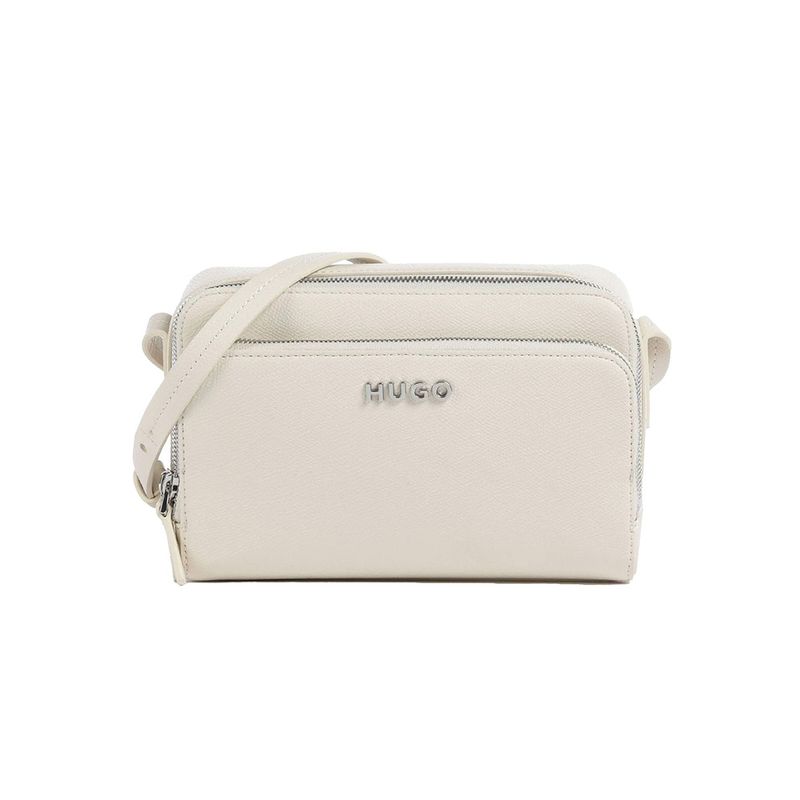 Bolso bandolera Hugo para mujer, elaborado en una mezcla de 62% poliuretano reciclado y 30% poliéster que ofrece resistencia y un acabado elegante. Su diseño estructurado incorpora dos compartimentos principales con cierre de cremallera, ideales para organizar pertenencias de manera segura. La textura graneada y el logotipo metálico de la marca en la parte frontal aportan un estilo moderno y atemporal. Compacto y versátil, este bolso es perfecto para el día a día o para complementar looks casuales con un toque sofisticado.