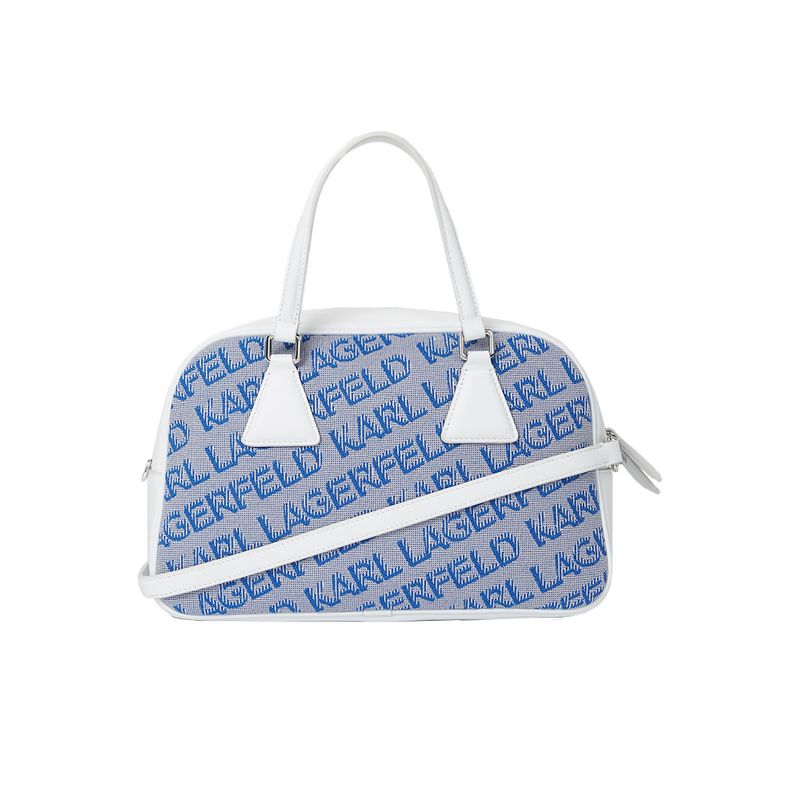 Bolso con diseño diagonal del logotipo de KARL le da a este bolso bowling retro un look atrevido y juvenil. Este accesorio divertido de silueta redondeada está confeccionado en lona de algodón resistente y se complementa con detalles prácticos, como una correa cruzada opcional para un estilo versátil.