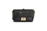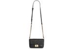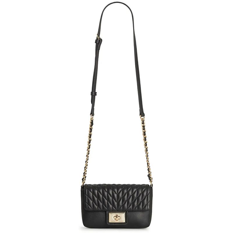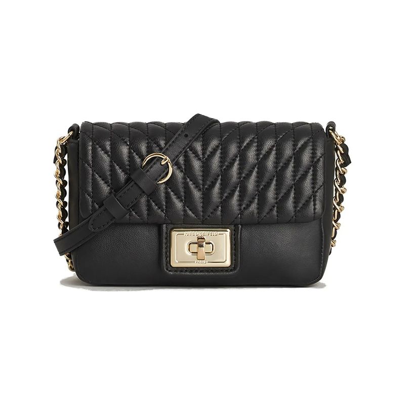 Bolso Karl Lagerfeld para mujer elaborado en cuero de cordero de primera calidad con acabado acolchado en patrón geométrico que aporta sofisticación y estilo. Incluye correa ajustable con cadena metálica dorada entretejida en cuero, ideal para llevar al hombro o cruzado. Cuenta con cierre metálico giratorio al frente grabado con el logotipo de la marca y forro interior en poliéster que asegura resistencia y durabilidad. Su diseño compacto lo convierte en el complemento perfecto para ocasiones elegantes o looks de noche, reflejando la esencia moderna y refinada de Karl Lagerfeld.