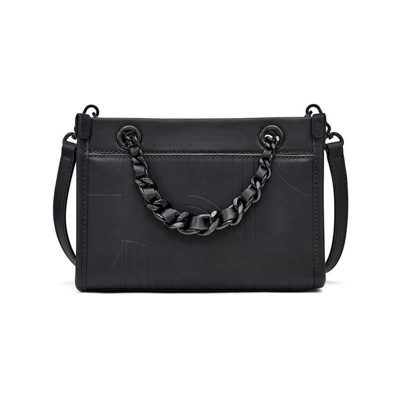 Bolso tipo bandolera Karl Lagerfeld para mujer, elaborado en cuero vacuno que ofrece una textura firme, elegante y de alta durabilidad. Su diseño compacto incluye una correa ajustable y una cadena decorativa frontal que aporta un estilo moderno y sofisticado. Cuenta con acabado en relieve con el logotipo de la marca, además de un interior forrado en poliéster que protege los objetos personales. Ideal para looks casuales o de noche, este bolso combina funcionalidad y estilo icónico característico de Karl Lagerfeld