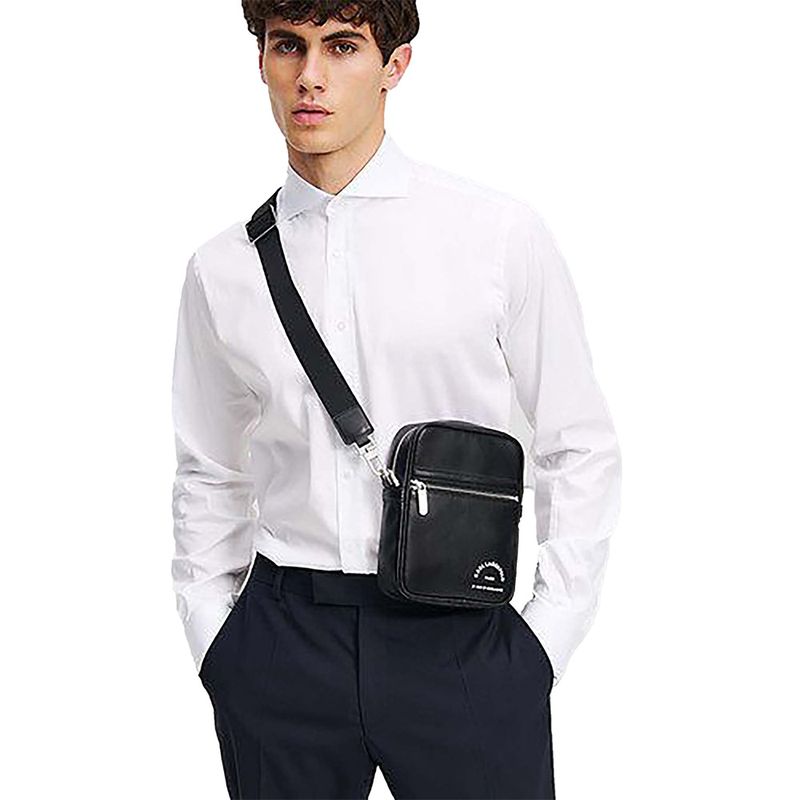 Bolso tipo crossbody Karl Lagerfeld KL para hombre, confeccionado en 100% poliuretano, un material sintético resistente, ligero y fácil de limpiar. Su diseño compacto y funcional incluye compartimento principal amplio, bolsillo frontal con cierre y forro interior suave que protege los objetos personales. El acabado liso y los detalles metálicos en cremallera aportan un estilo moderno y versátil, ideal para uso diario, viajes o actividades urbanas. Gracias a su correa ajustable, ofrece comodidad y practicidad sin sacrificar la estética característica de la marca