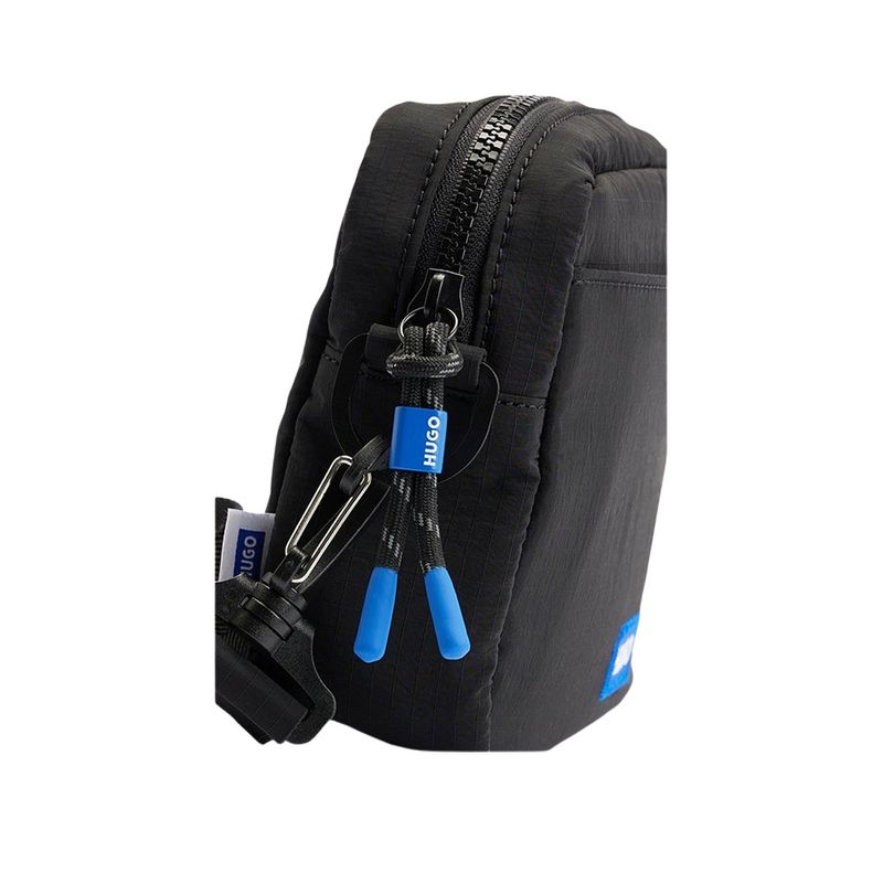 Bolso reporter HUGO para hombre, elaborado en poliamida reciclada que aporta resistencia y ligereza. Su diseño minimalista en color negro se complementa con el logo HUGO en contraste azul en la parte frontal, ofreciendo un estilo moderno y distintivo. Incluye un compartimento principal con cremallera, detalles de tiradores con acentos azules y una correa ajustable que permite llevarlo cómodamente cruzado o al hombro. Una opción versátil y contemporánea para el día a día