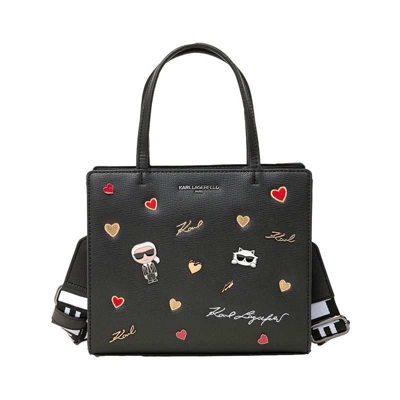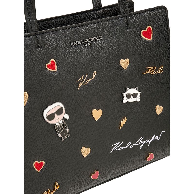 Bolso tote Karl Lagerfeld para mujer confeccionado en material sintético (PVC) de alta resistencia con acabado texturizado. Su diseño rectangular combina practicidad y estilo, incorporando asas superiores y correa ajustable para mayor versatilidad. Decorado con parches gráficos bordados y estampados en relieve, entre ellos corazones, la firma “Karl” y la icónica ilustración de Karl Lagerfeld y su gata Choupette. Forro interno en poliéster que garantiza durabilidad. Un bolso moderno y juvenil, ideal para looks casuales y urbanos con un toque original.