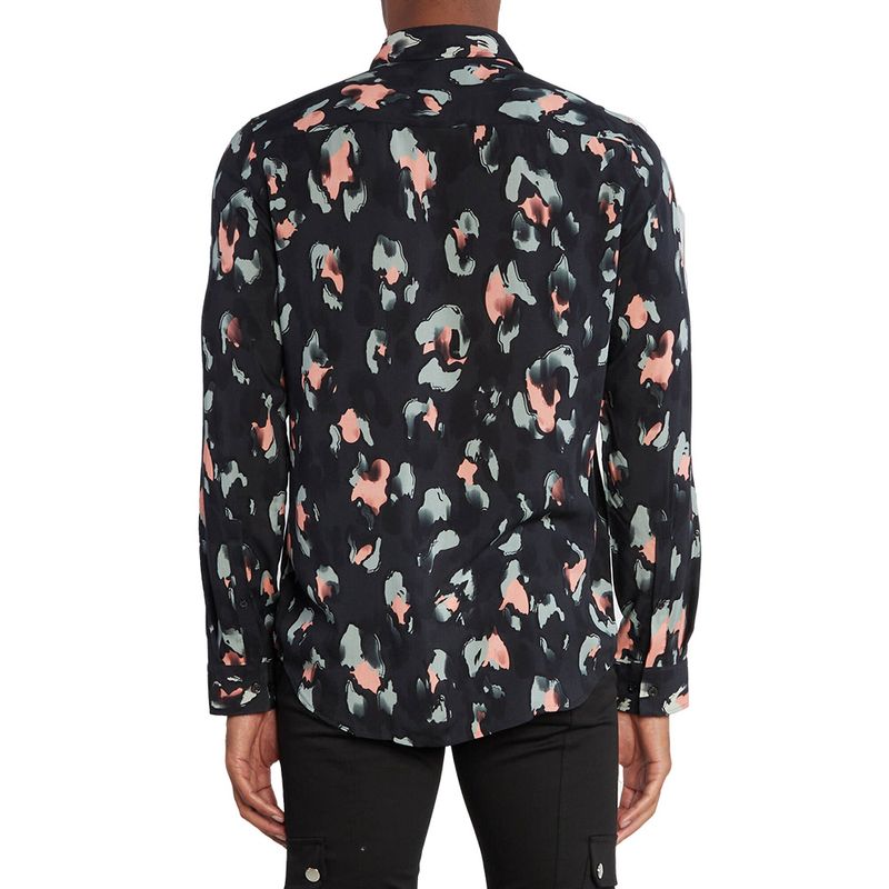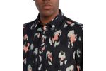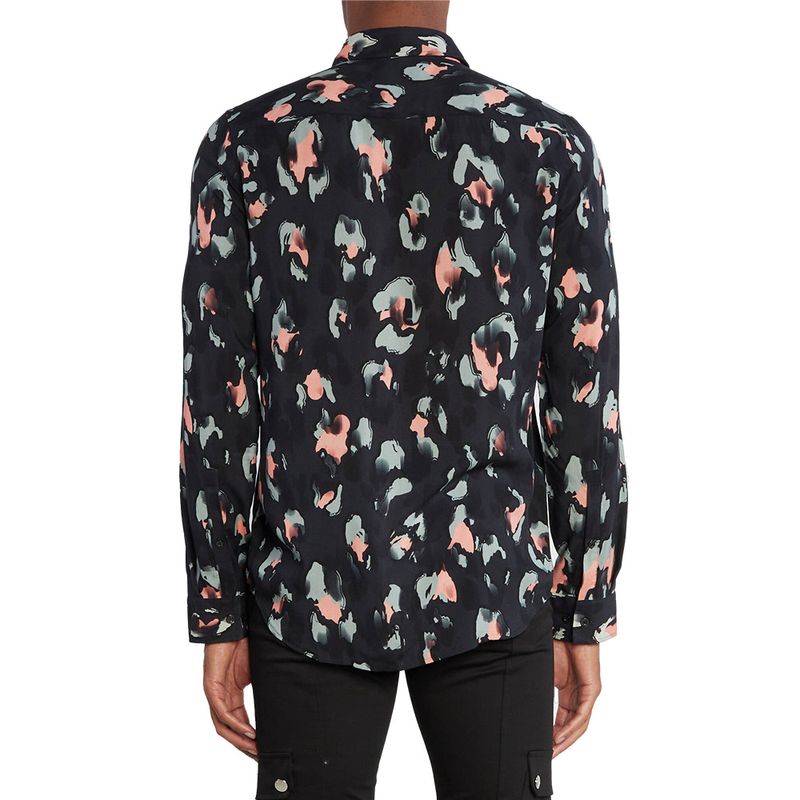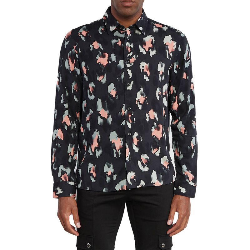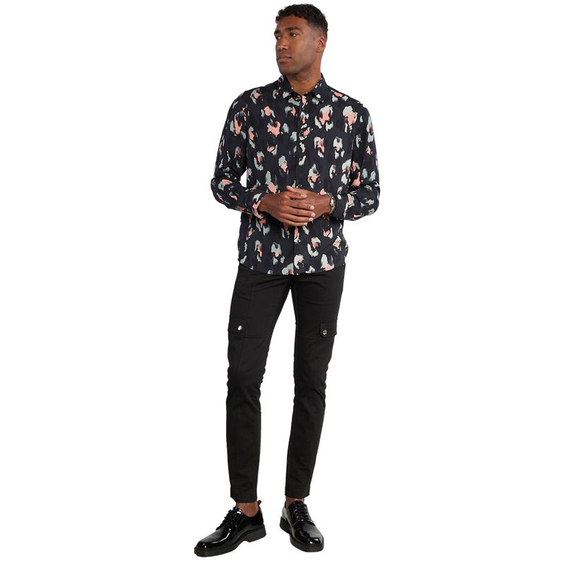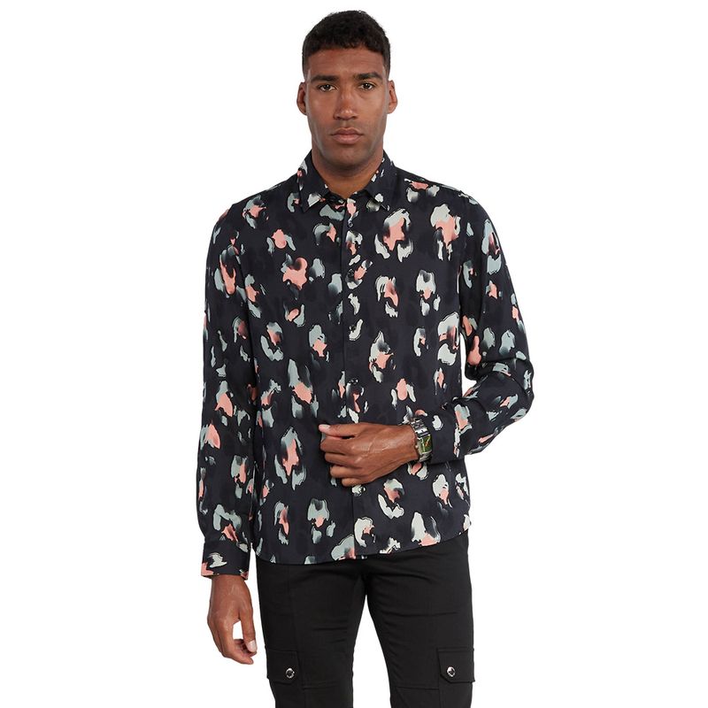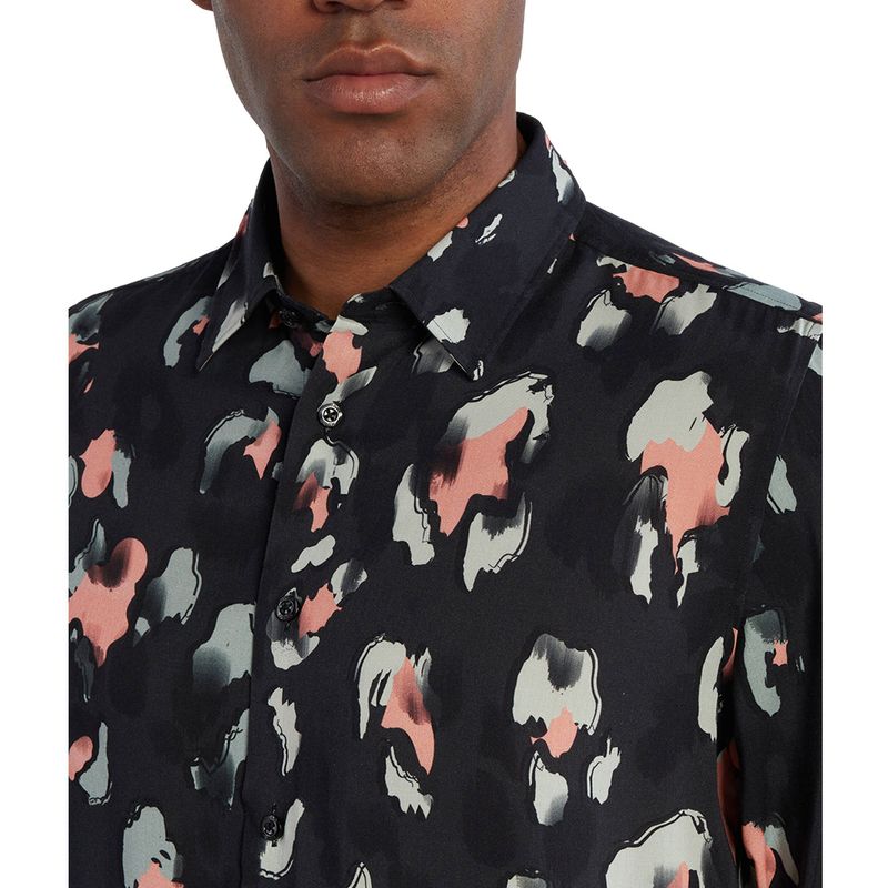 Camisa de manga larga HUGO para hombre, confeccionada en 100% viscosa que aporta suavidad y frescura Presenta un estampado abstracto en tonos naranja y gris sobre fondo negro, con cuello camisero clásico y cierre de botones frontales Su corte regular fit ofrece comodidad y versatilidad, ideal para looks casuales con un toque moderno y sofisticado