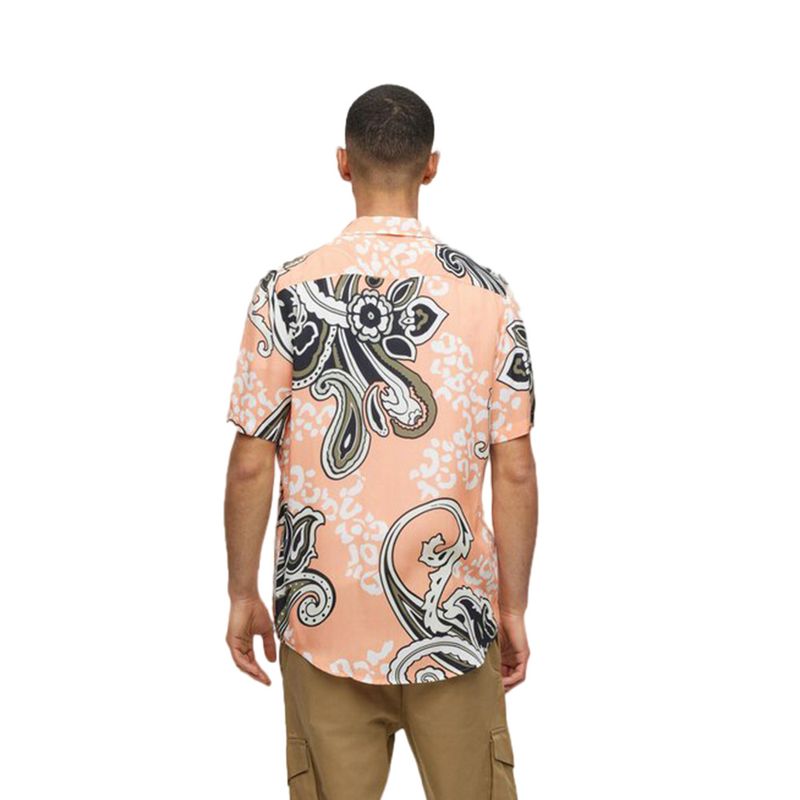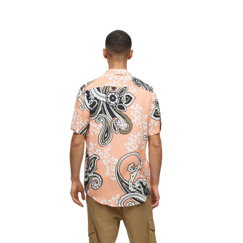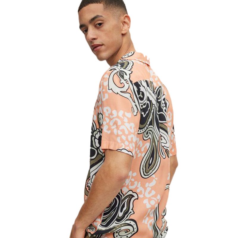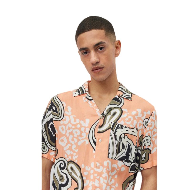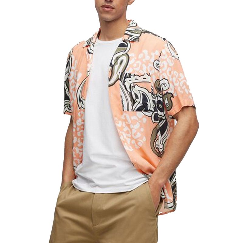 Camisa HUGO para hombre en corte regular fit, confeccionada en tejido ligero que proporciona frescura y comodidad ideal para climas cálidos Destaca por su estampado abstracto multicolor en tonos coral, beige, negro y blanco, que aporta un estilo moderno y desenfadado Presenta cuello abierto tipo resort, cierre frontal con botones y bolsillo aplicado en el pecho Perfecta para combinar con bermudas o pantalones casuales en looks de verano o vacaciones