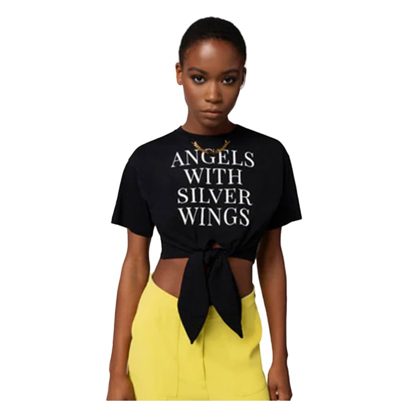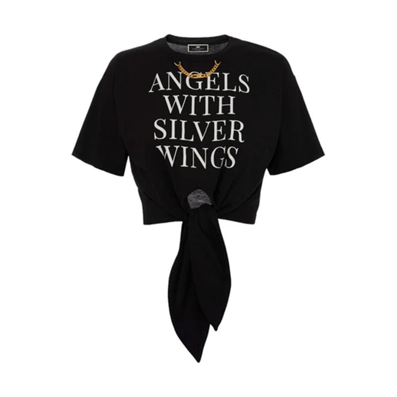 Camiseta Elisabetta Franchi con mensaje tipográfico y nudo frontal para mujer