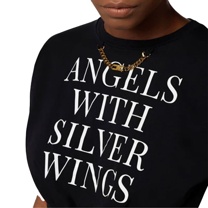 Camiseta Elisabetta Franchi para mujer confeccionada en algodón 100%, que ofrece suavidad, frescura y comodidad durante todo el día. Presenta un corte moderno tipo crop con nudo frontal integrado, que estiliza la silueta y aporta un toque contemporáneo. El diseño se destaca por el mensaje tipográfico en contraste en la parte frontal, acompañado de un delicado detalle de cadena dorada en el cuello que añade un acento joya característico de la marca. El color azul oscuro ruerza su carácter sofisticado y urbano, ideal para combinar con pantalones de talle alto, faldas o denim, logrando looks casuales con personalidad y estilo italiano