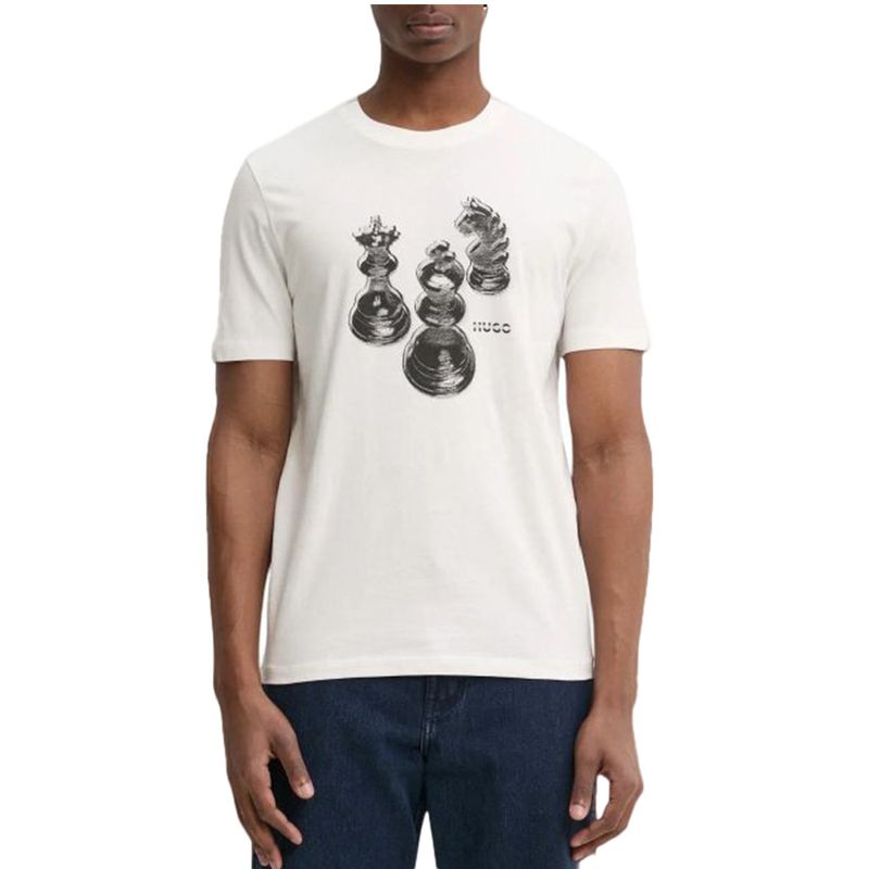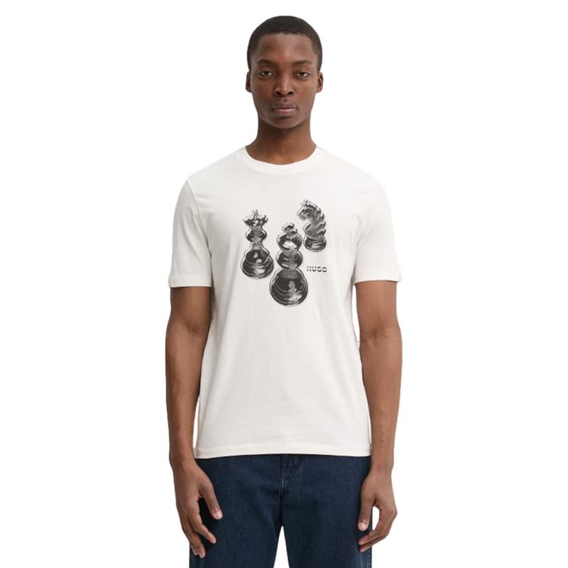 Camiseta HUGO para hombre confeccionada en 100% algodón suave, con un estampado artístico de piezas de ajedrez en la parte frontal que aporta un toque moderno y original. Su corte regular y cuello redondo garantizan comodidad y versatilidad, ideal para un look casual con estilo. Perfecta para combinar con jeans o pantalones de corte recto, reflejando la esencia creativa y contemporánea de la marca HUGO.