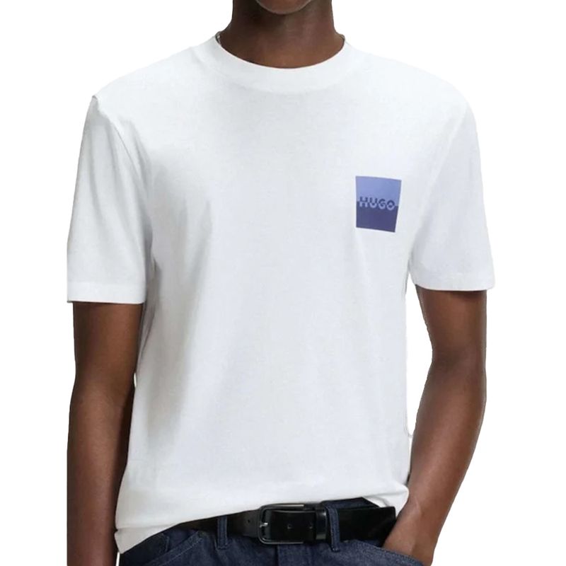 Camiseta Hugo para hombre con diseño minimalista y cuello redondo clásico. Presenta el distintivo logo cuadrado de la marca en el pecho, aportando un toque moderno al look. Su confección ofrece suavidad y confort, ideal para un estilo casual o urbano.