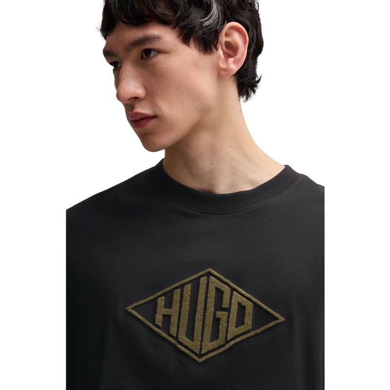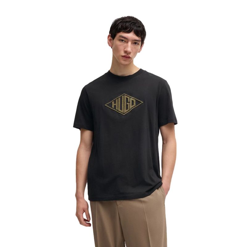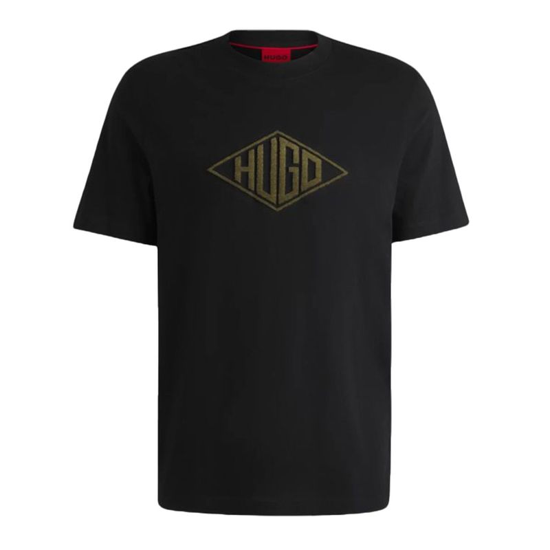 Camiseta HUGO confeccionada en 100% algodón de alta calidad. Presenta un diseño clásico con cuello redondo y mangas cortas, realzado con un distintivo logotipo HUGO en tono dorado sobre el pecho. Ideal para un look moderno y casual con un toque sofisticado. Su tejido suave y transpirable garantiza confort durante todo el día. Perfecta para combinar con jeans, pantalones o chaquetas.