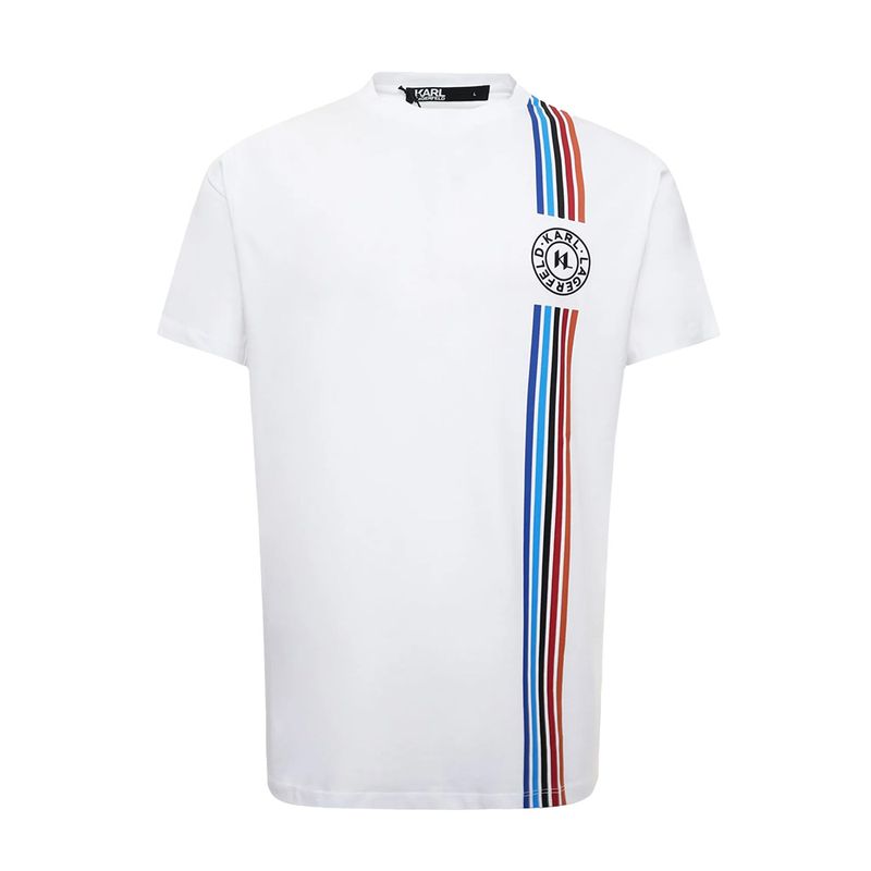 Camiseta de cuello redondo Karl Lagerfeld para hombre, confeccionada en una mezcla de algodón y elastano que ofrece suavidad, ligereza y un ajuste cómodo. Destaca por su diseño moderno con franjas verticales en tonos azul, rojo y negro en el lateral derecho, junto al icónico logotipo circular de la marca. Su estilo minimalista con detalles gráficos aporta un toque contemporáneo ideal para looks casuales con carácter urbano y sofisticado.