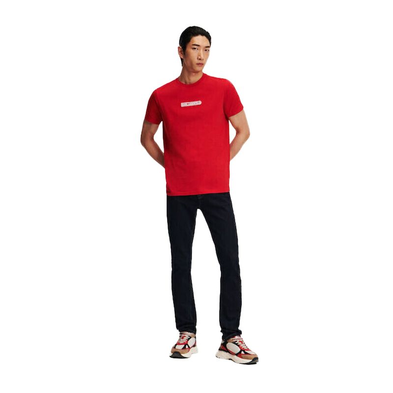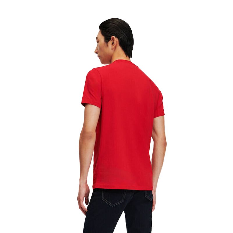 Camiseta de cuello redondo Karl Lagerfeld para hombre, confeccionada en suave mezcla de algodón y elastano que garantiza confort y libertad de movimiento. Presenta el logotipo de la marca en relieve al frente, destacando sobre el fondo rojo con un estilo moderno y distintivo. Su diseño minimalista y corte regular la convierten en una prenda versátil, ideal para looks casuales con un toque de sofisticación contemporánea.