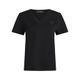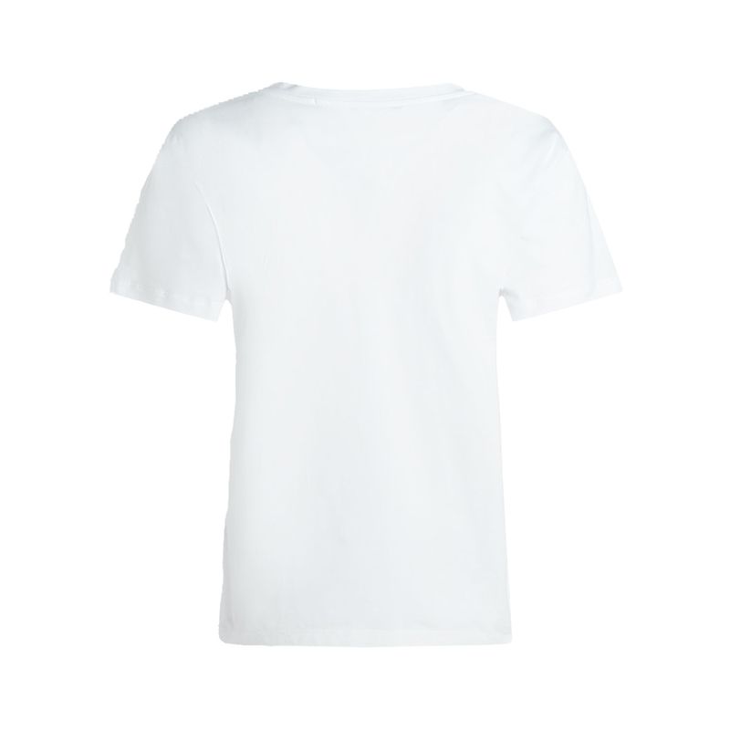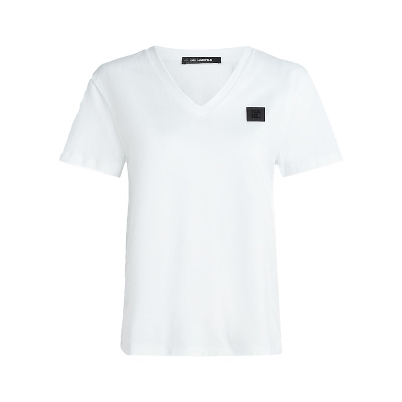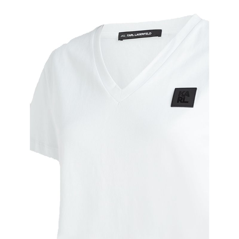 Camiseta Karl Lagerfeld para mujer confeccionada en 100% algodón, con diseño moderno y versátil. Incorpora cuello en V, manga corta y un distintivo logotipo de la marca en forma de cuadro ubicado en el costado derecho. Su tejido de algodón ofrece suavidad, comodidad y transpirabilidad, convirtiéndola en una prenda esencial para looks casuales y elegantes