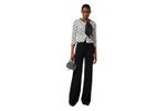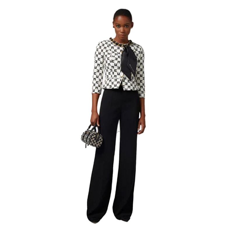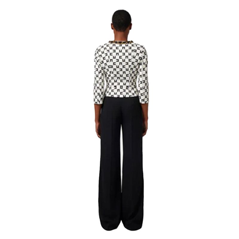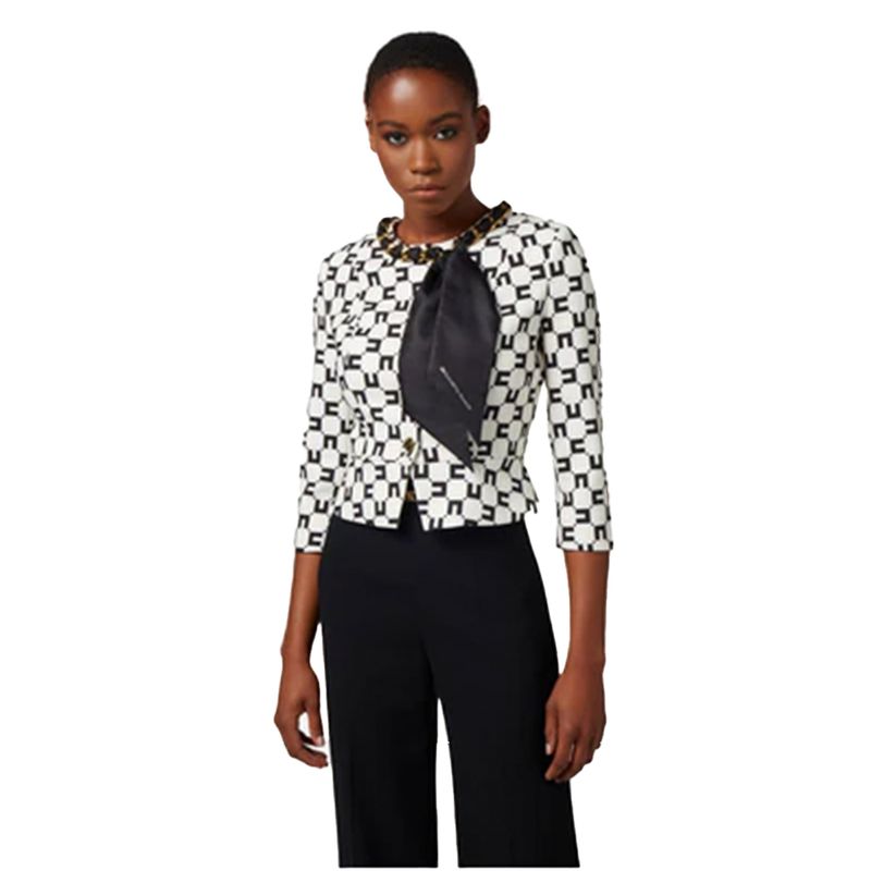 Chaqueta Elisabetta Franchi para mujer, confeccionada en tejido elástico de alta calidad que aporta comodidad y ajuste preciso. Presenta un diseño estructurado con estampado geométrico en contraste, cuello redondo adornado con cadena dorada y botones joya frontales que elevan su carácter elegante. Incorpora un rinado detalle de lazo en el frente que añade feminidad y distinción al diseño. Ideal para looks formales o conjuntos sofisticados de día y noche, esta prenda rleja el estilo icónico y el lujo contemporáneo característico de Elisabetta Franchi