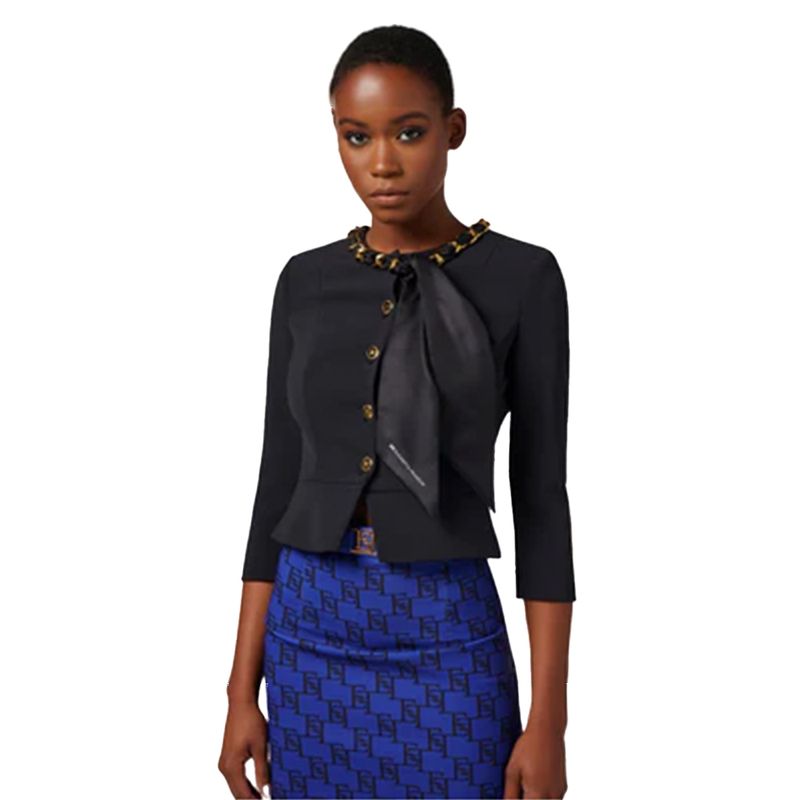 Chaqueta Elisabetta Franchi para mujer, confeccionada en tejido elástico de alta calidad que garantiza comodidad y un ajuste impecable. Su diseño de corte estructurado presenta cuello redondo adornado con una elegante cadena dorada y botones joya frontales que aportan sofisticación. Incorpora un rinado lazo frontal en tejido satinado que añade feminidad y distinción a la prenda. Ideal para looks formales, eventos especiales o combinaciones elegantes de día y noche, esta chaqueta rleja el lujo y la identidad icónica de Elisabetta Franchi