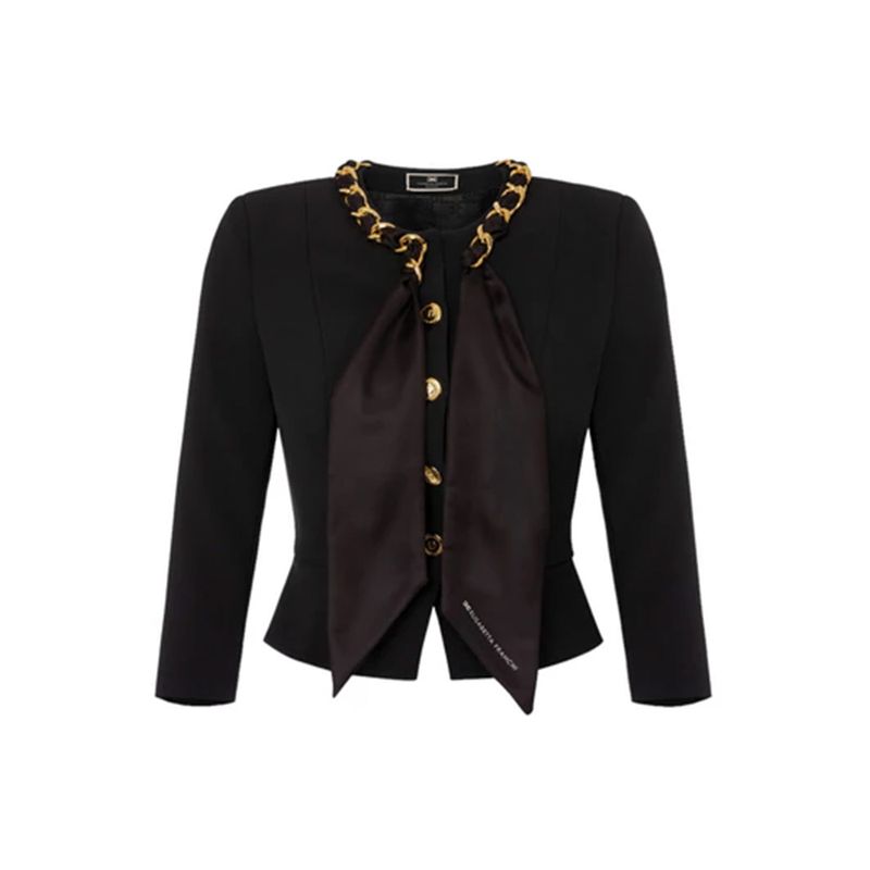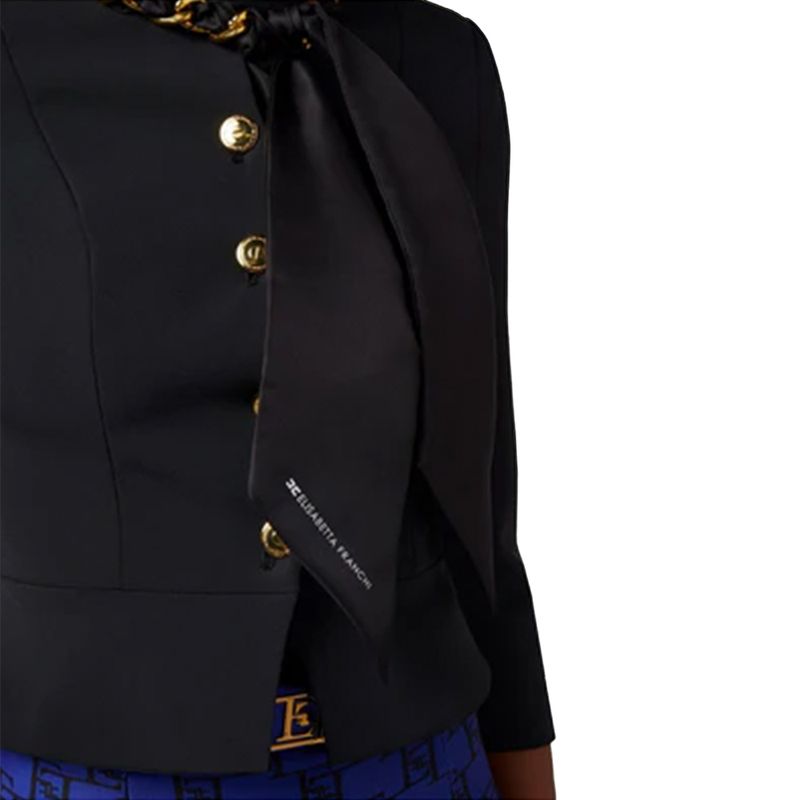 Chaqueta Elisabetta Franchi negra con cadena dorada y lazo frontal elegante para mujer