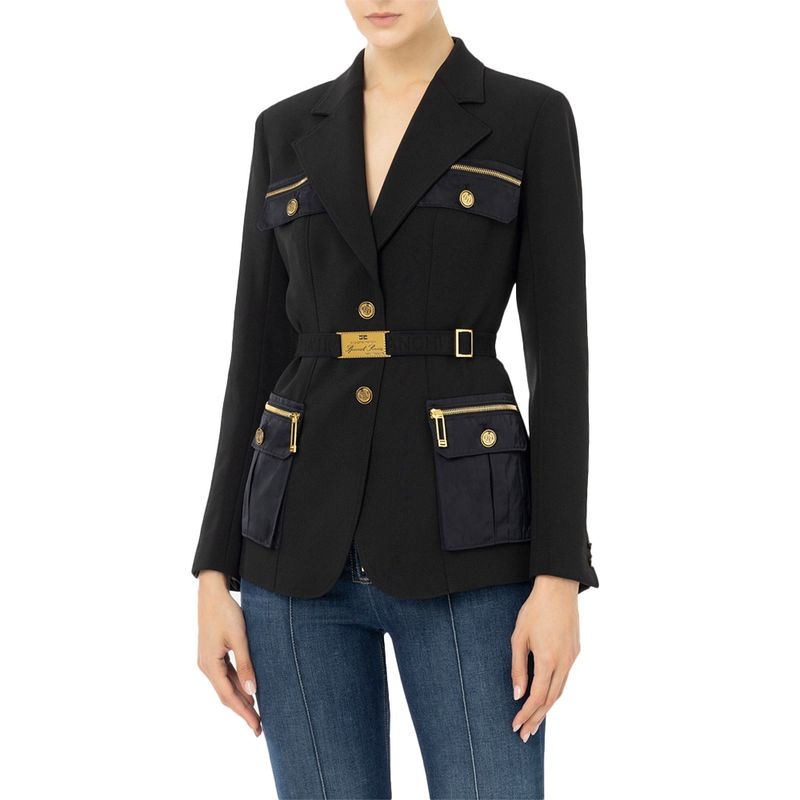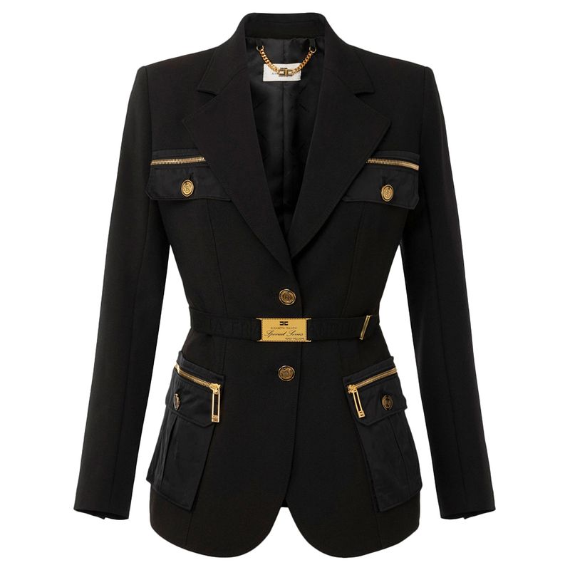 Chaqueta Elisabetta Franchi negra estilo utilitario con cinturón y detalles dorados para mujer