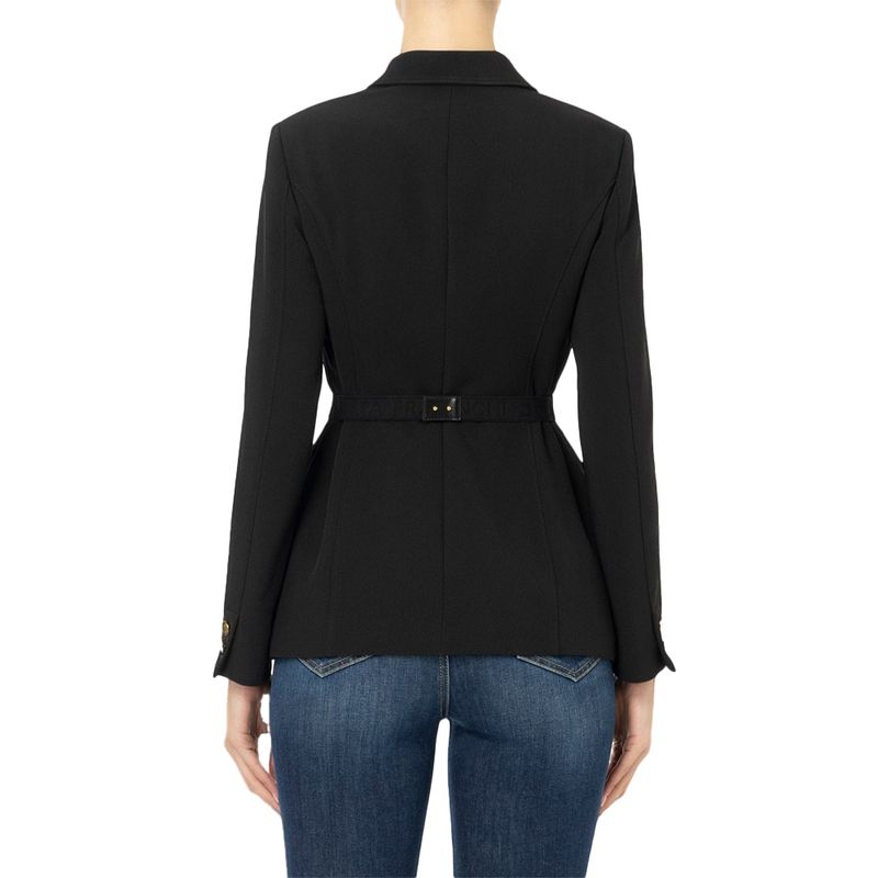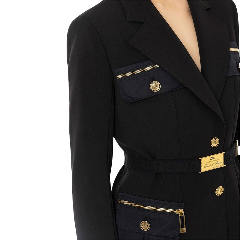 Chaqueta Elisabetta Franchi para mujer confeccionada en una elegante mezcla de poliéster con elastano que proporciona estructura, confort y un ajuste perfecto. Presenta un rinado diseño de inspiración utilitaria con solapas clásicas, múltiples bolsillos frontales con solapa y cremalleras decorativas, todos realzados con botones y herrajes dorados distintivos de la firma. Incorpora cinturón integrado con placa metálica Elisabetta Franchi que dine la silueta y aporta un toque exclusivo. Su corte entallado la convierte en una prenda icónica para estilismos urbanos sofisticados, looks de oficina modernos o combinaciones elegantes de día y noche. Una chaqueta con carácter que rleja el lujo contemporáneo y la identidad inconfundible de la maison italiana