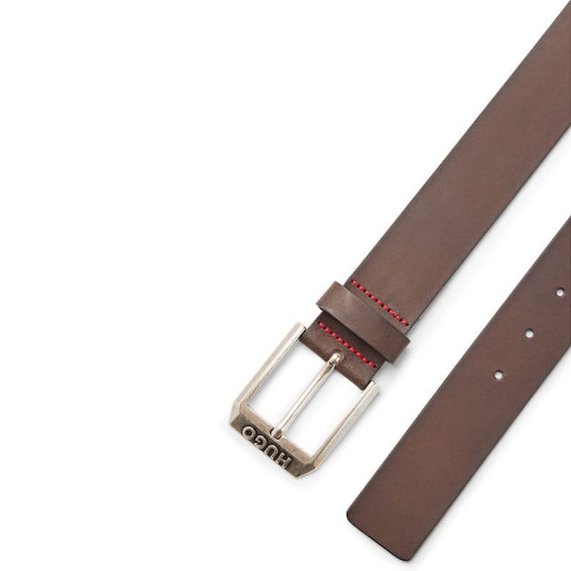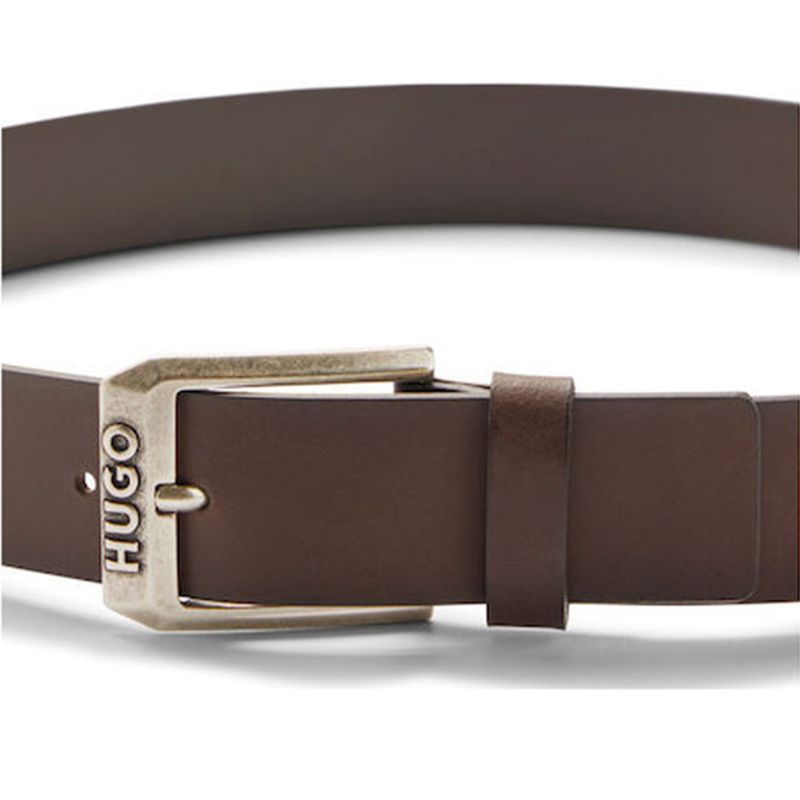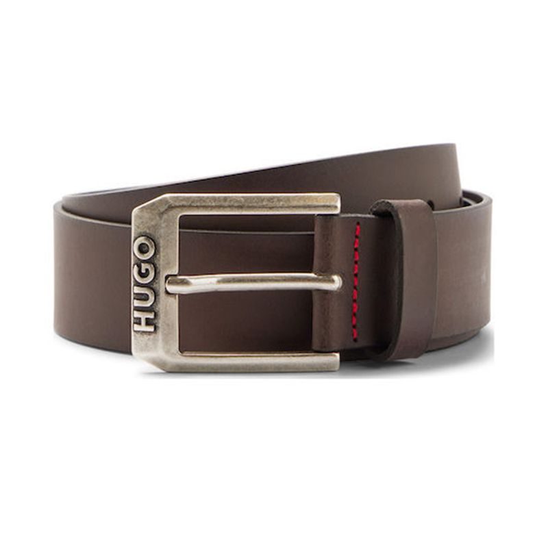 Cinturón Hugo para hombre elaborado con un diseño contemporáneo que combina elegancia y funcionalidad Destaca su hebilla metálica rectangular con grabado de la marca HUGO, aportando un toque distintivo y sofisticado El detalle de costuras en contraste en color rojo le añade un estilo moderno y único Ideal para complementar looks casuales o elegantes, este cinturón es un accesorio versátil y atemporal