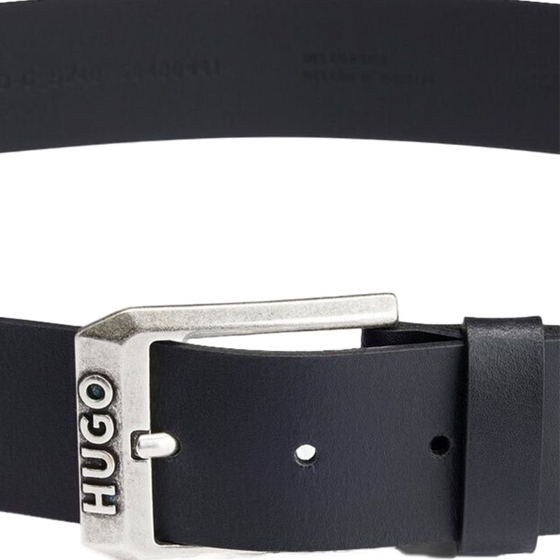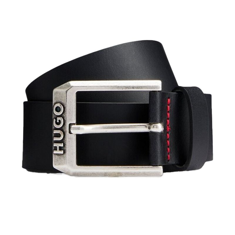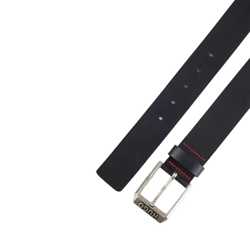 Cinturón Hugo para hombre elaborado con un diseño contemporáneo que combina elegancia y funcionalidad Destaca su hebilla metálica rectangular con grabado de la marca HUGO, aportando un toque distintivo y sofisticado El detalle de costuras en contraste en color rojo le añade un estilo moderno y único Ideal para complementar looks casuales o elegantes, este cinturón es un accesorio versátil y atemporal