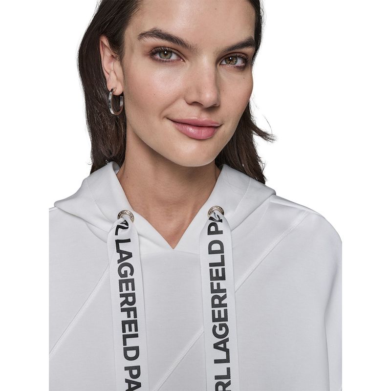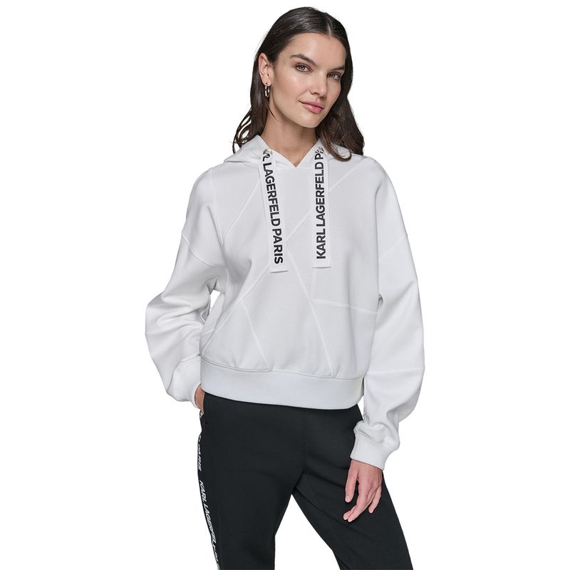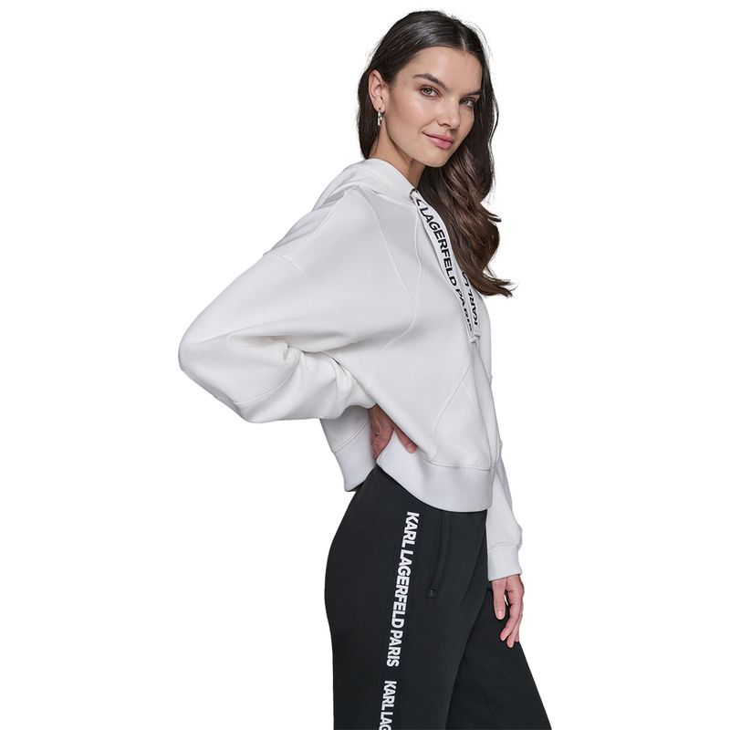Conjunto deportivo Karl Lagerfeld para mujer, diseñado en un estilo moderno y urbano que combina comodidad y sofisticación. El hoodie blanco con capucha cuenta con cordones estampados con el logotipo Karl Lagerfeld Paris, aportando un detalle distintivo y elegante. El pantalón tipo jogger en color negro presenta cintura elástica y franjas laterales con la marca, que realzan el diseño dinámico de la prenda. Confeccionado en materiales suaves y resistentes, este conjunto es ideal tanto para looks casuales como para actividades de tiempo libre, reflejando el estilo vanguardista característico de Karl Lagerfeld.