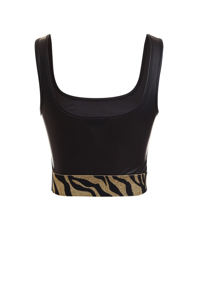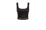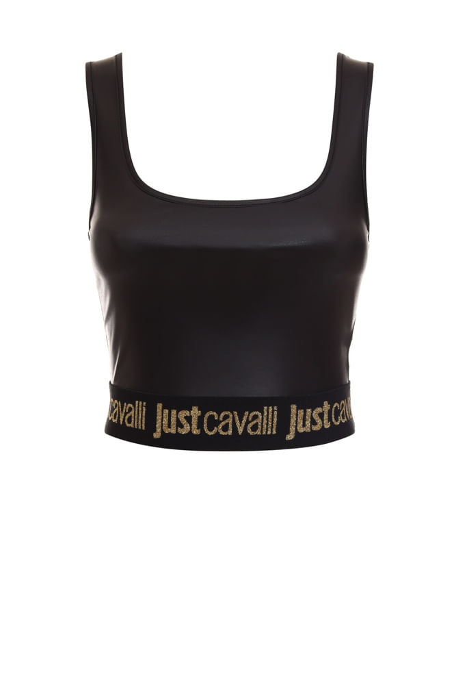 Crop top en polyamida estilo brillante, ajustado a la figura, manga sisa y pretina en cinta marcada de la Just Cavalli en dorado.