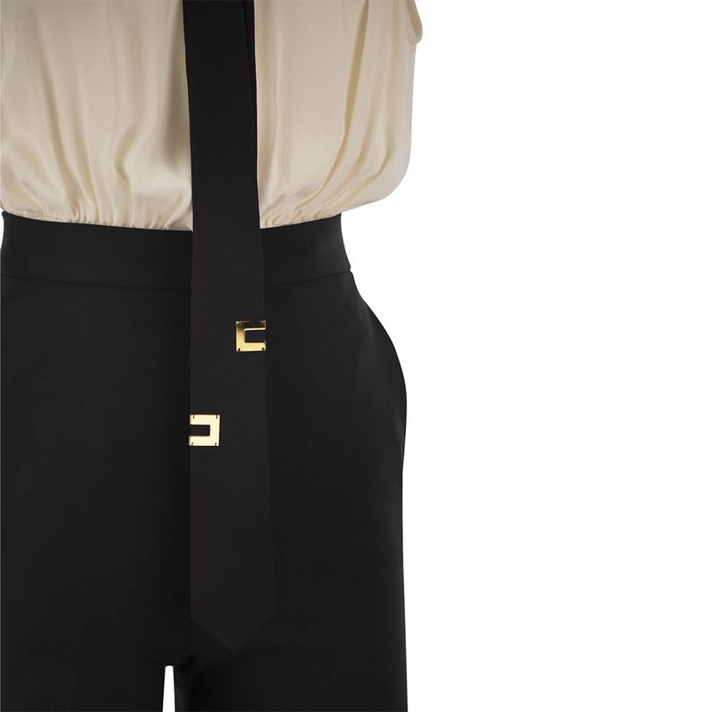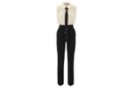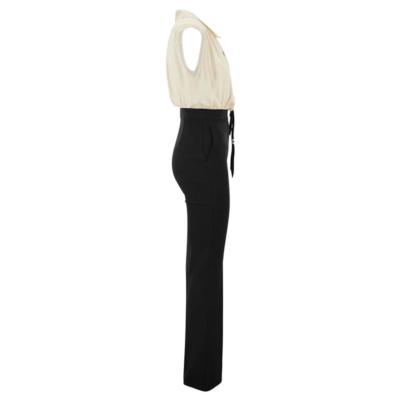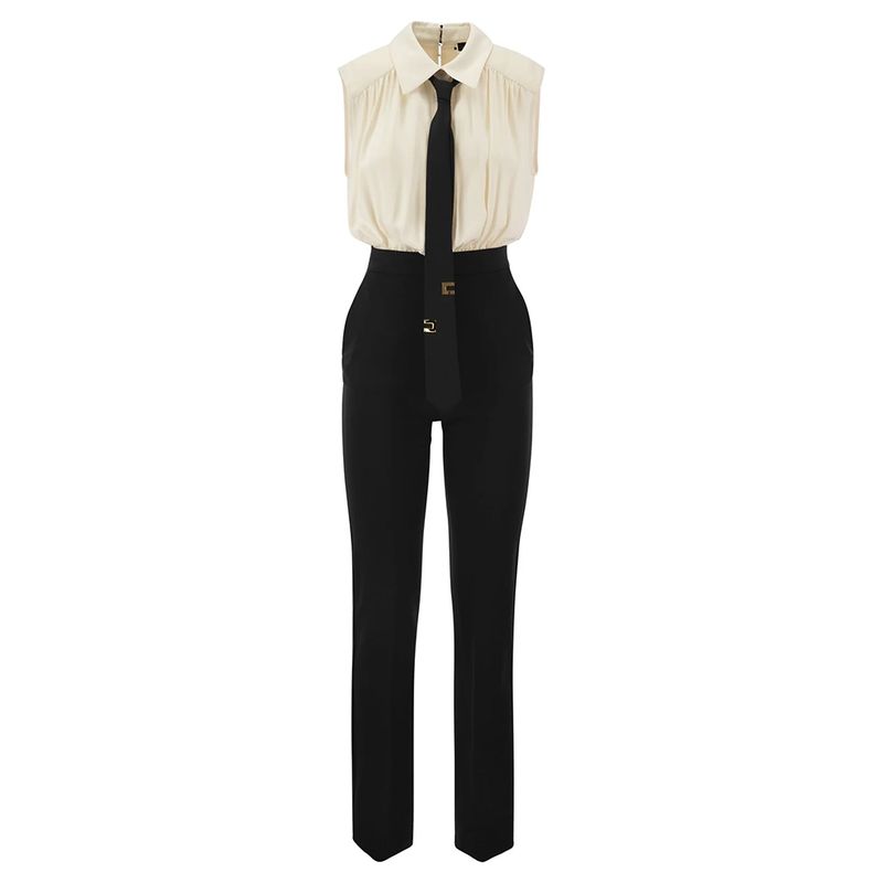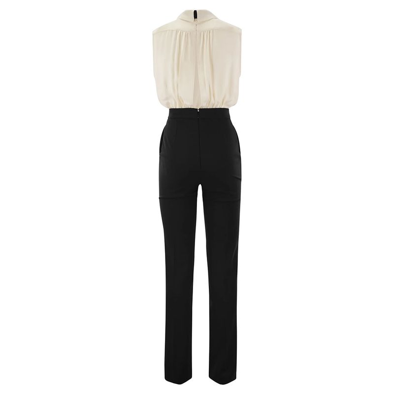 Enterizo Elisabetta Franchi para mujer de diseño bicolor que combina sofisticación y feminidad en una sola pieza. Presenta un cuerpo superior en tono beige con caída suave y fruncido delicado, contrastado con un pantalón negro de corte recto que estiliza la silueta. Confeccionado en tejido ligero que aporta comodidad y movimiento, cuenta con cierre posterior discreto que mantiene una estética limpia y rinada. Ideal para eventos formales, ocasiones especiales o looks elegantes de día y noche, rlejando el estilo contemporáneo y la elegancia característica de la marca.