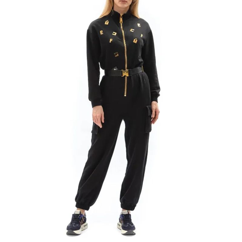 Enterizo Elisabetta Franchi para mujer de diseño contemporáneo y espíritu urbano, confeccionado para ofrecer comodidad sin perder sofisticación. Presenta una silueta relajada con cintura ajustable mediante cinturón integrado, cierre frontal con cremallera metálica y detalles de letras doradas que aportan un acento distintivo de la marca. Su diseño versátil lo convierte en una prenda ideal para looks casuales elevados o estilismos urbanos con carácter, manteniendo siempre la estética elegante y moderna característica de Elisabetta Franchi.