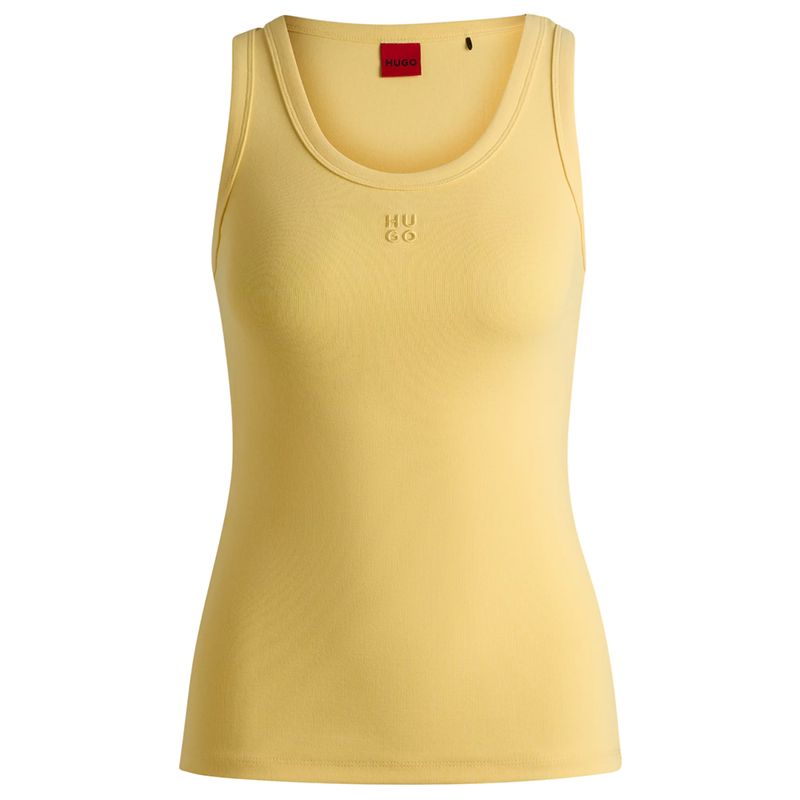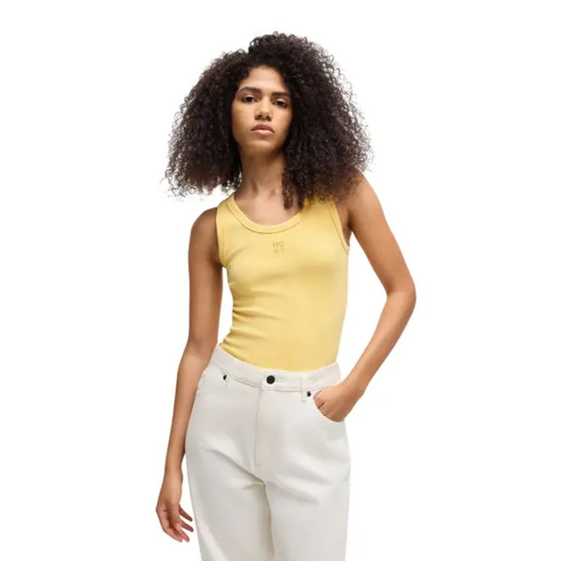 Esqueleto Hugo (HU) para mujer, diseñado con corte ajustado que realza la figura y ofrece un look fresco y versátil. Confeccionado en una mezcla de algodón, poliéster reciclado y elastano, brinda suavidad, elasticidad y un compromiso con la sostenibilidad. Su estilo minimalista con logo discreto en el pecho lo convierte en una prenda ideal para combinar con jeans, shorts o faldas en atuendos casuales y urbanos. Perfecto para climas cálidos o como prenda base en looks en capas.