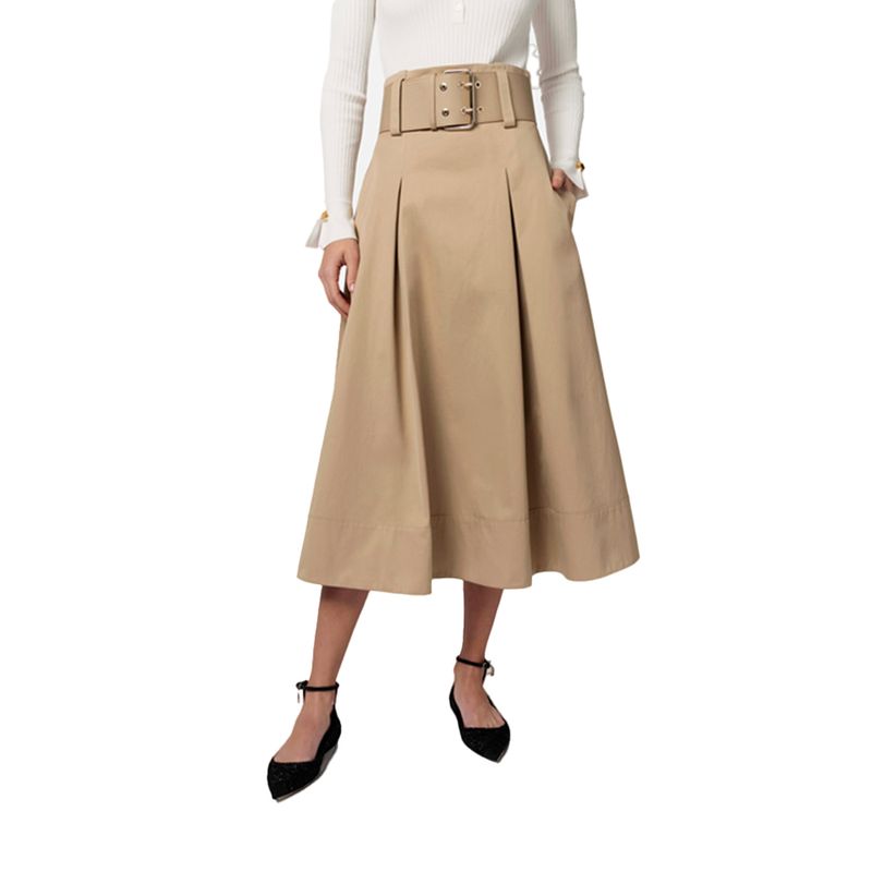 Falda midi Elisabetta Franchi para mujer, confeccionada en 100% algodón que garantiza frescura, comodidad y una caída suave. Su diseño de silueta fluida incorpora pinzas frontales que aportan volumen controlado y un cinturón ancho integrado con hebilla metálica, realzando la cintura de forma elegante. Presenta terminaciones limpias y un corte sofisticado que la convierte en una prenda versátil para looks de día, outfits casuales elevados o combinaciones elegantes de inspiración contemporánea. Esta falda rleja el equilibrio entre funcionalidad y rinamiento característico de Elisabetta Franchi