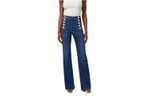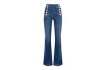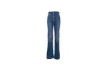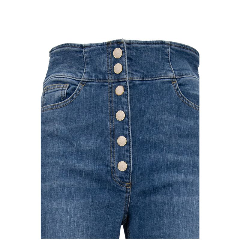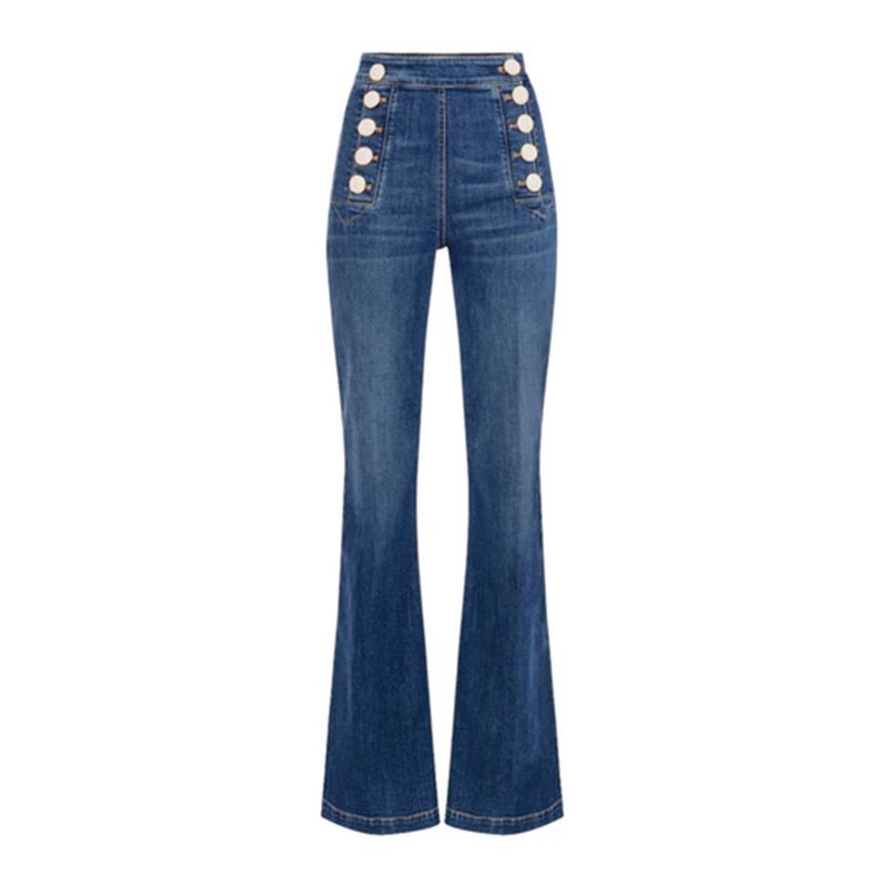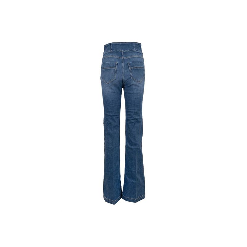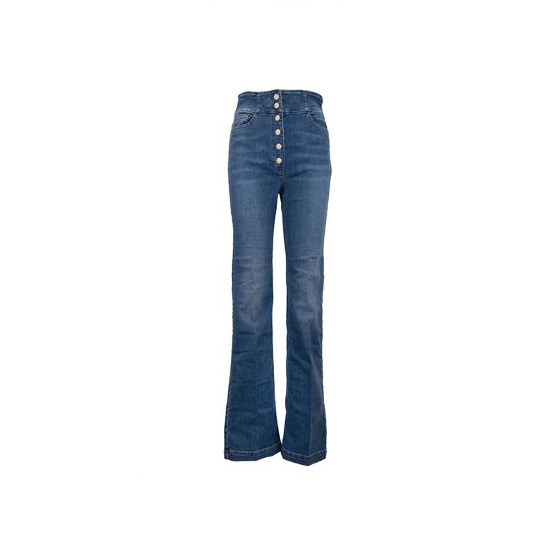 Jean Elisabetta Franchi para mujer de tiro alto y silueta acampanada, diseñado para realzar la figura con un estilo sofisticado y de inspiración retro. Confeccionado en denim de algodón con mezcla de elastomultiéster y elastano que aporta confort, elasticidad y excelente recuperación de forma. Presenta una elegante botonadura frontal metálica que se convierte en el foco del diseño, además de bolsillos funcionales y costuras dinidas. Ideal para looks casual chic, estilismos urbanos o combinaciones modernas con un toque fashion distintivo