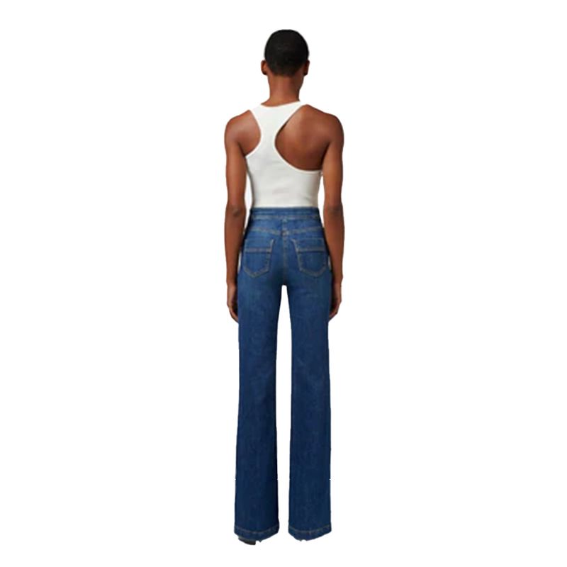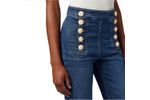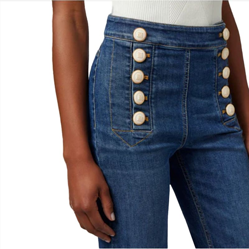 Jean de denim estructurado con botones metálicos visibles y ajuste favorecedor