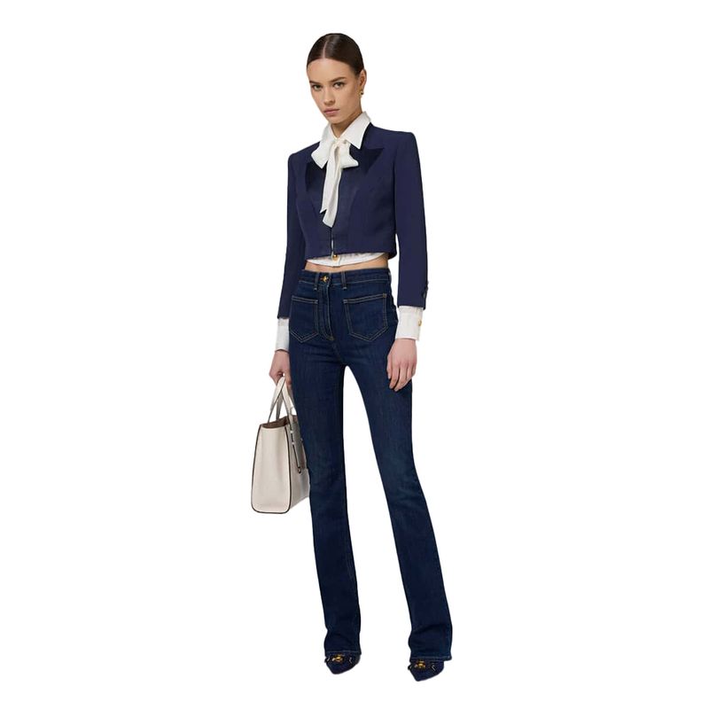 Jean Elisabetta Franchi para mujer de tiro alto y corte flare, confeccionado en denim de algodón con un ligero porcentaje de elastano que aporta comodidad y libertad de movimiento. Su diseño limpio y minimalista realza la silueta gracias a la pierna acampanada, que alarga visualmente las piernas y aporta un estilo elegante y femenino. Un básico sofisticado ideal para looks diarios rinados o combinaciones más formales con blusas, tops estructurados o chaquetas sastre.