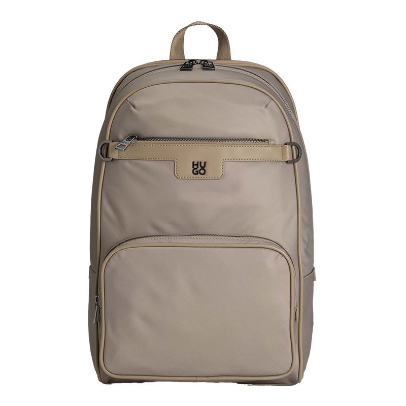Mochila HUGO para hombre, elaborada en poliéster reciclado de alta resistencia que combina funcionalidad y estilo contemporáneo. Presenta un compartimento principal amplio con cierre de cremallera, bolsillo frontal exterior para fácil acceso y logo metálico HUGO en la parte superior. Sus correas ajustables acolchadas aseguran comodidad durante todo el día, mientras que el diseño en color beige la convierte en una pieza versátil ideal para el trabajo, la universidad o el uso diario.