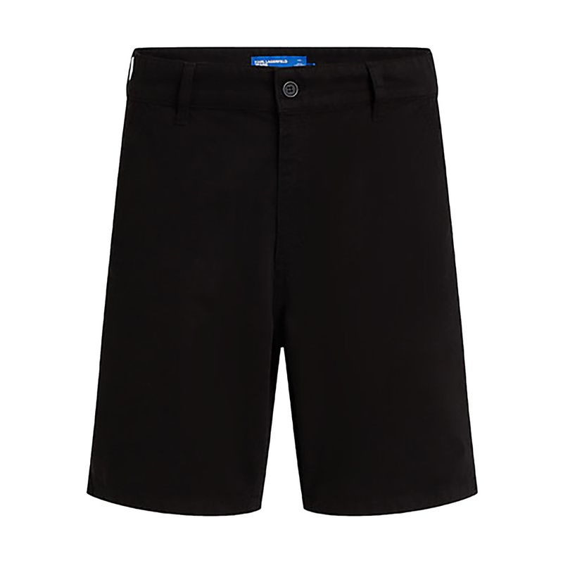 Pantalón corto Karl Lagerfeld Jeans para hombre, confeccionado en 100% algodón de alta calidad que proporciona comodidad y transpirabilidad. Su diseño minimalista en color negro presenta bolsillos laterales y traseros, trabillas para cinturón y cierre con cremallera y botón. Ideal para un look casual y sofisticado, perfecto para combinar con camisetas o camisas en los días cálidos.