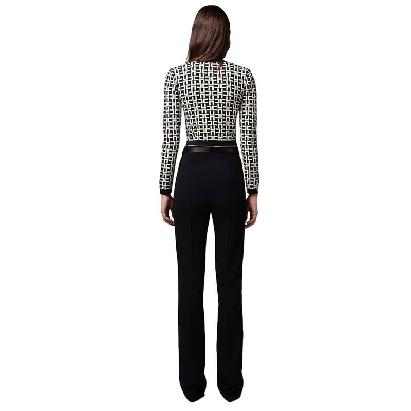 Pantalón Elisabetta Franchi para mujer de tiro alto y corte recto, diseñado para ofrecer una silueta estilizada con un aire elegante y contemporáneo. Confeccionado en una mezcla de poliéster y elastano que garantiza comodidad, elasticidad y una caída estructurada. Incorpora un cinturón integrado con hebilla metálica dorada que aporta un toque distintivo y sofisticado al diseño. Su estética minimalista lo convierte en una prenda versátil, ideal para looks formales, outfits de oficina o estilismos rinados de día y noche. Presenta acabados impecables característicos de la marca