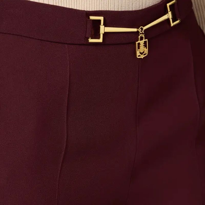 Pantalón de corte recto con línea lateral en contraste y herrajes dorados que realzan el diseño