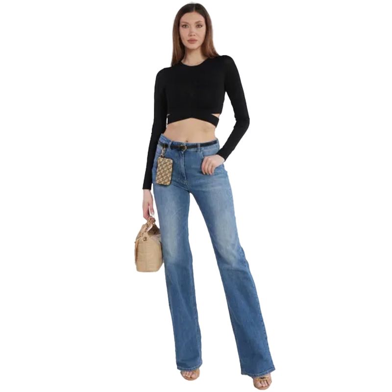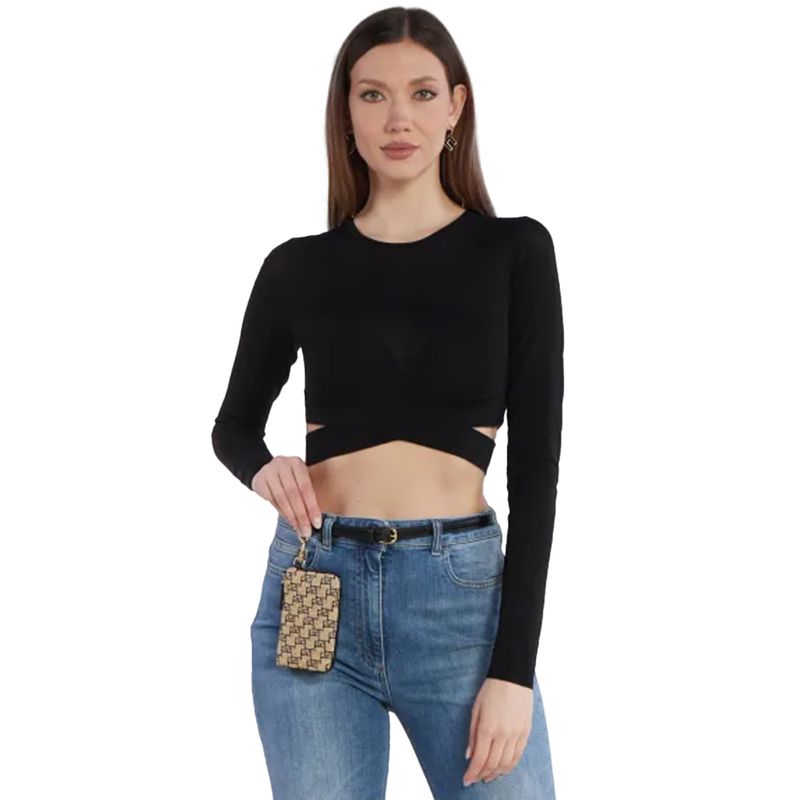 Sweater Elisabetta Franchi para mujer confeccionado en una rinada mezcla de viscosa y poliamida que ofrece una textura suave, ligera y confortable. Presenta un diseño contemporáneo de manga larga con escote redondo y una estructura cruzada en la parte frontal que genera delicadas aberturas laterales a la altura de la cintura, aportando un toque sensual y sofisticado sin perder elegancia. Su silueta corta realza la figura y lo convierte en una prenda ideal para looks modernos y urbanos. El color negro aporta versatilidad y estilo atemporal, perfecto para combinar con jeans de tiro alto, pantalones sastre o faldas, logrando un outfit elegante con un marcado sello de diseño italiano